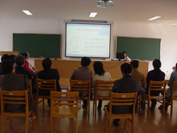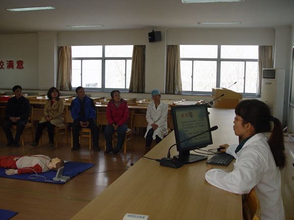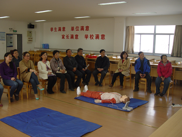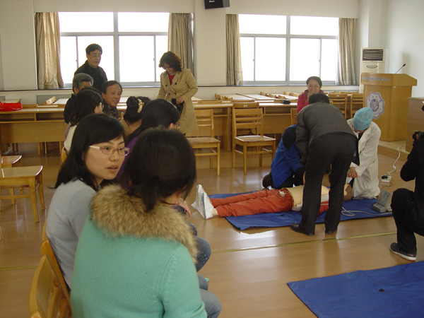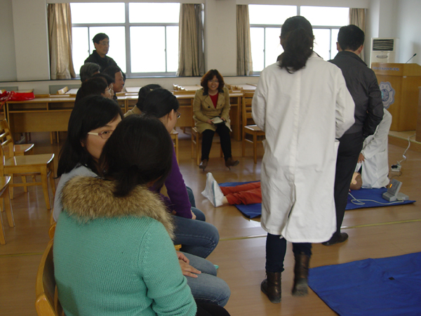 2:30心肺复苏培训课准时开始,学校医院的谷香兰医生用PPT给大家详细讲解了急救的7个步骤,之后又由校医院的医生在珍妮真人(仿真人)上进行模拟示范,现场学习交流非常仔细,每个人都在珍妮真人上进行了模拟操作,包括心脏的挤压、口对口的人工呼吸等。学院宫必宁教授还和大家分享了抢救家中老人的经验。通过这次培训,大家掌握了急救的常识,感到在遇到突发性的事件时,可以沉着应对。