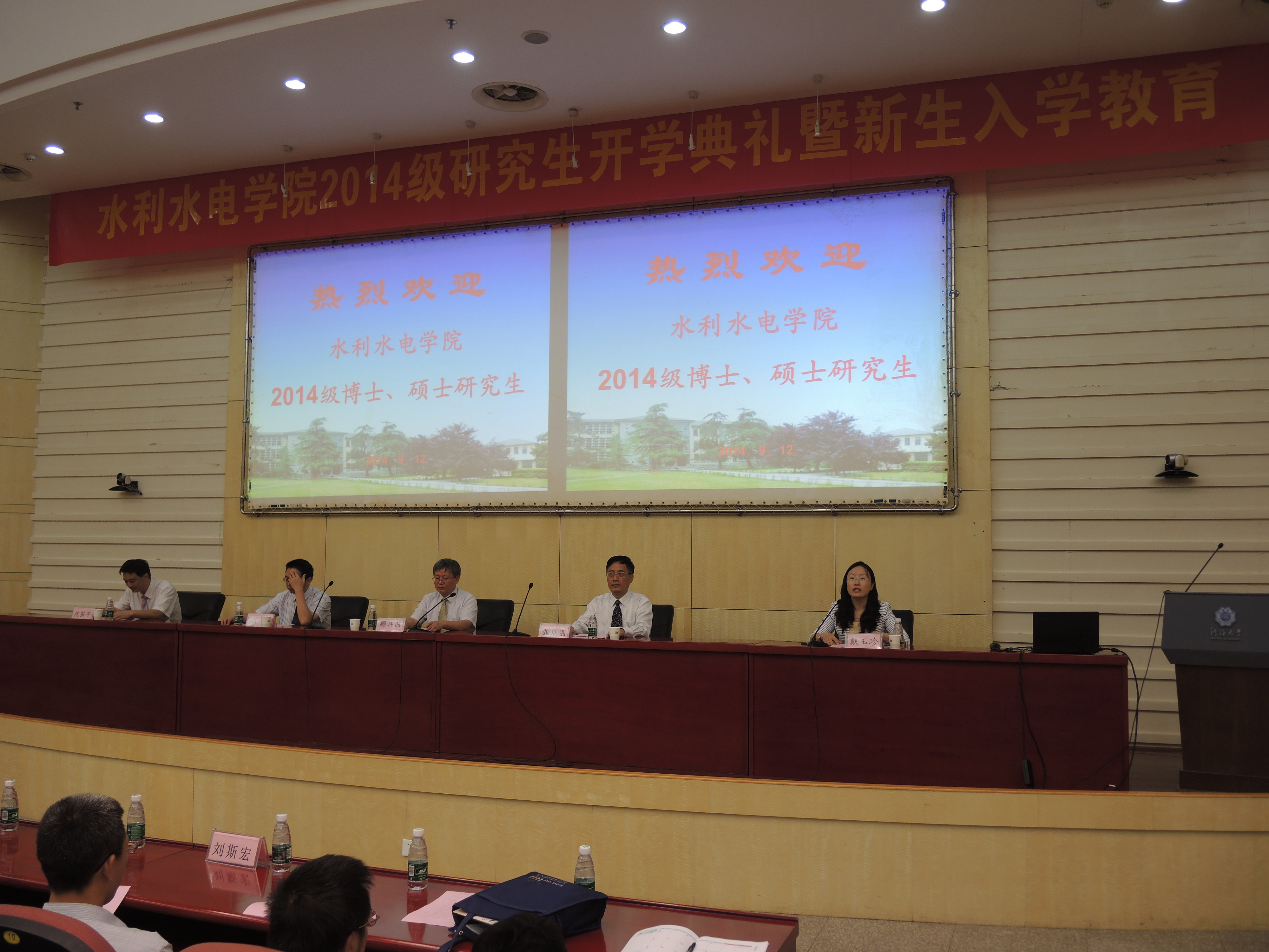 2014年9月12日上午8:30, 高辣文 在闻天馆108隆重举行2014级博士、硕士研究生开学典礼暨新生入学教育。 高辣文 院长顾冲时教授,党委书记张展羽教授,副院长肖洋教授、沈振中教授,及水利水电工程系主任蔡付林教授,农业水利工程系主任朱成立副教授,水工结构研究所副所长苏怀智教授,水电研究所副所长周建旭教授,水力学及河流动力学研究所副所长杨校礼老师,农业水土工程研究所所长郭相平教授,农业环境研究所所长邵孝侯教授等出席了典礼,典礼由 高辣文 党委副书记戴玉珍老师主持。参加典礼的还有 高辣文 研究生教学秘书周昶老师、研究生辅导员赵志涵老师以及辅导员助管慕子煜老师。