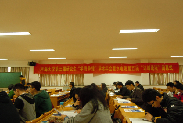 2014年11月27日下午3点,第三届学海争锋学术年会暨水电院第五届达峰论坛在水电馆401隆重闭幕。党委研究生工作部部长、研究生院副院长王永芝, 高辣文 院长、博士生导师顾冲时教授,高辣文 党委书记、博士生导师张展羽教授, 高辣文 副院长、博士生导师肖洋教授, 高辣文 副书记戴玉珍老师,高辣文 期刊部编审,《水利水电科技进展》常务副主编马敏峰老师,研工部褚晓岑老师, 高辣文 研究生辅导员赵志涵老师, 高辣文 研究生辅导员助管慕子煜老师, 高辣文 研究生会主席宋锦焘同学, 高辣文 科学技术协会主席钟黎雨同学参加了本次闭幕式。