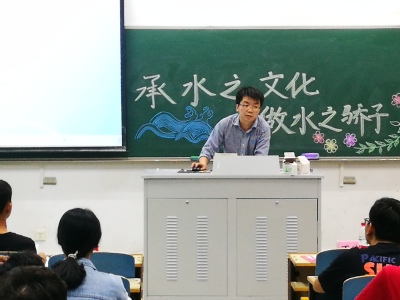 丁老师以灌溉水利用系数为引,向同学们详细介绍了改革开放以来我国水利事业的八大变化,并着重向同学们介绍了水利信息化这一当前热点。同时丁老师指出,我国目前总体上水环境形式还十分严峻,新老水问题交织,严重阻碍了国民经济的持续发展,并鼓励同学们行动起来,从身边做起,积极为我国水利事业的发展献言献策,添砖加瓦,争做一个优秀的水之子,活动在同学们热烈的掌声中达到了高潮。之后农水一班团支书刘金晶作为学生代表为同学们分享了传统水文化的发展历程,同时就本专业未来的发展趋势向大家做了介绍。