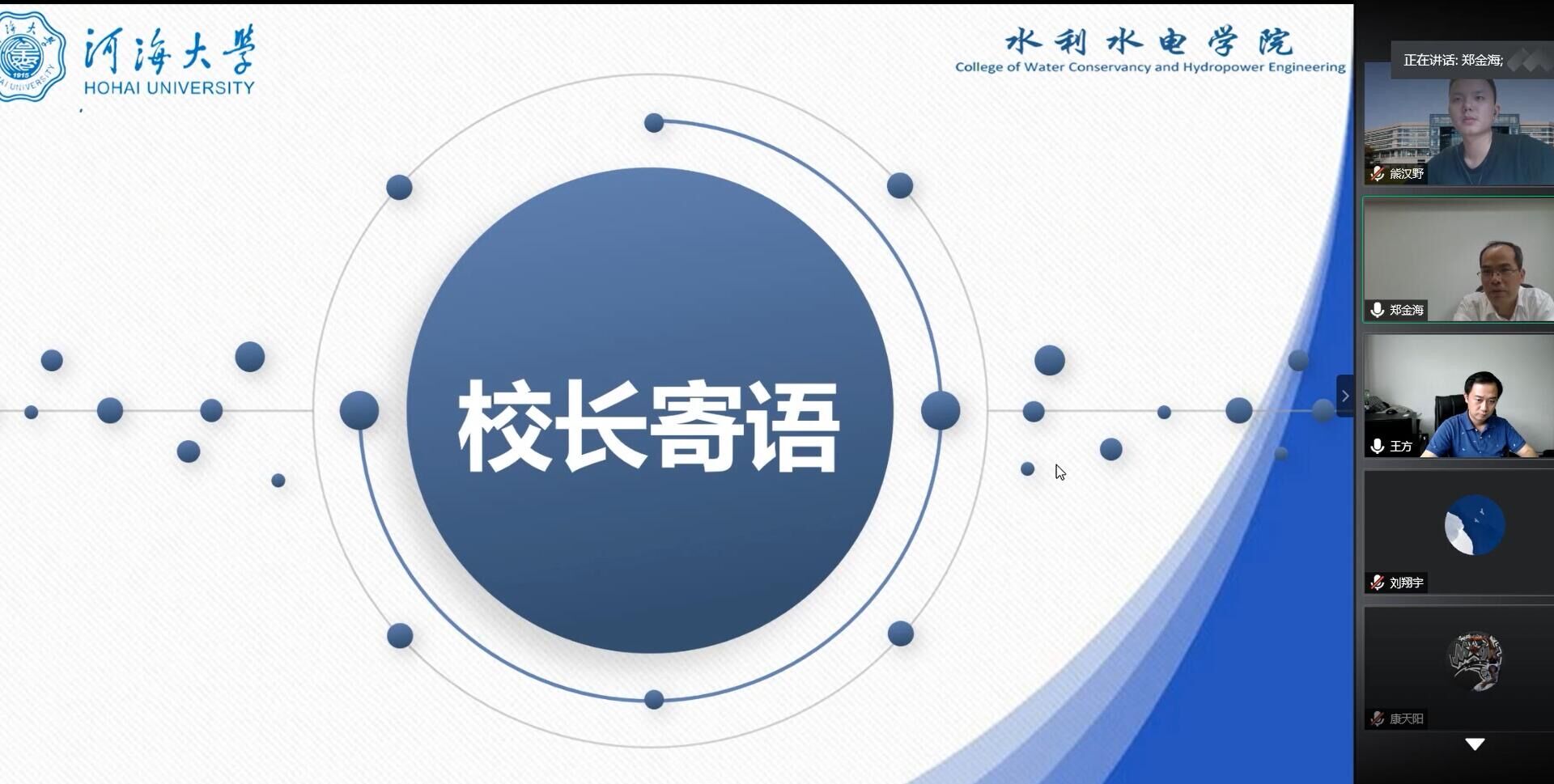 郑校长听取了2018级水工四班班长李东明所作的班级建设情况汇报、班级团支书张嘉芮所作的学风建设月经验总结以及熊汉野、渠谢雨、江文轩三位同学的交流发言。针对大学生现阶段问题,结合自身学习和工作经历,与同学们进行线上座谈,真正实现“零距离”对话、“心贴心”交流。