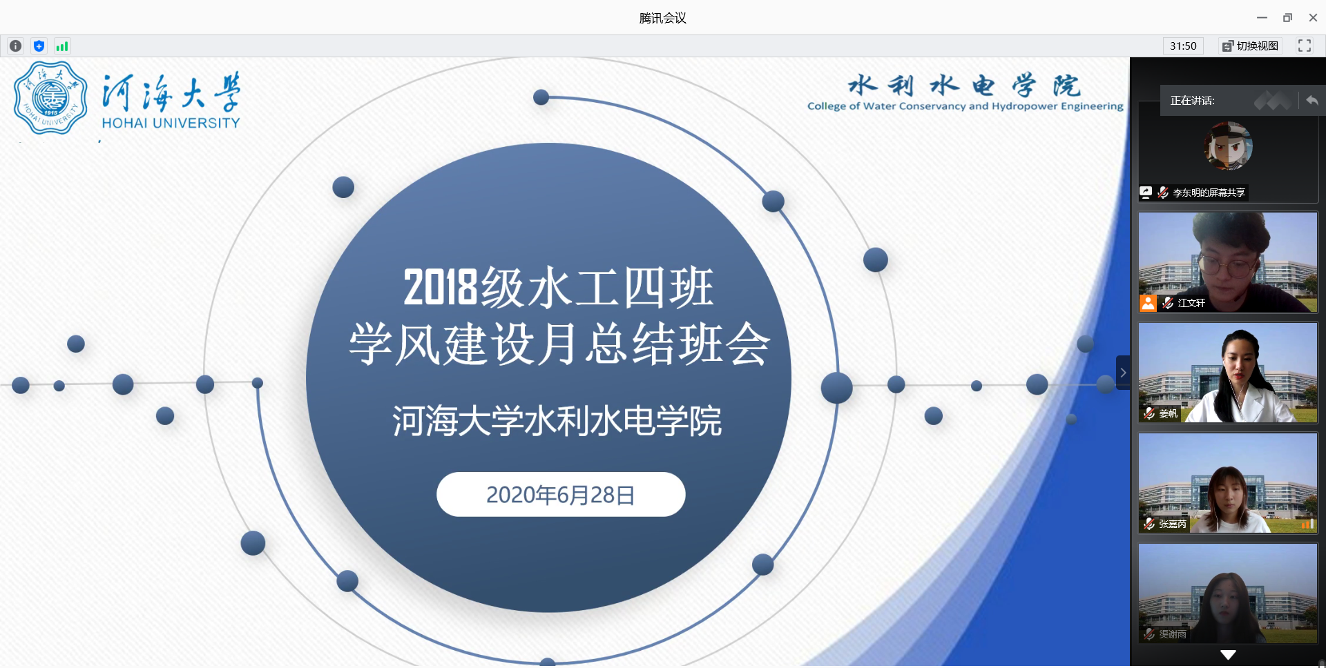 根据学校开展领导干部结对联系学生工作的相关要求和学院整体安排,6月28日下午,水电院2018级水工四班举办“隔空不隔爱,停课不停学”学风建设线上主题班会。高辣文 副校长郑金海、水电院党委副书记王方、2018级水工四班全体同学参加班会。2018级本科生辅导员姜帆主持班会。
