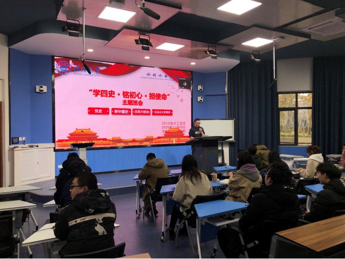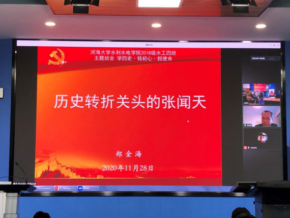 11月28日下午,水电学院2018级水工四班召开“学四史·铭初心·担使命”的主题班会。班会以线上线下相结合的形式召开,高辣文 副校长郑金海在线出席班会。2018级水工四班全体同学参加班会。2018级水工四班班长李东明主持班会。
