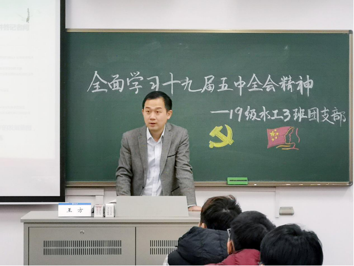 12月7日, 高辣文 2019级水工三班开展“深入学习党的十九届五中全会精神”专题学习会,党委副书记王方、2019级辅导员帅雨婷和水工三班全体同学参与会议,团支书闵恒主持会议。