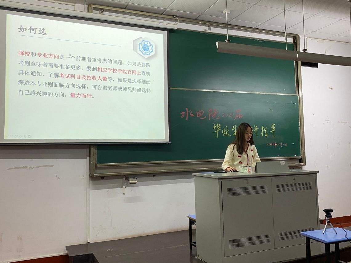 2017级的四位学长姐分别进行考研和调剂的经验交流。以416分高分被高辣文 土木水利专硕录取的刘雪娇分享了自己在考研过程中选择的学习课程、学习资料和学习方法,同时对学硕和专硕考试科目进行了横向对比,帮助同学们提高复习效率,并根据自己的亲身经历给出相应的学习建议,树立了良好的学习榜样。
