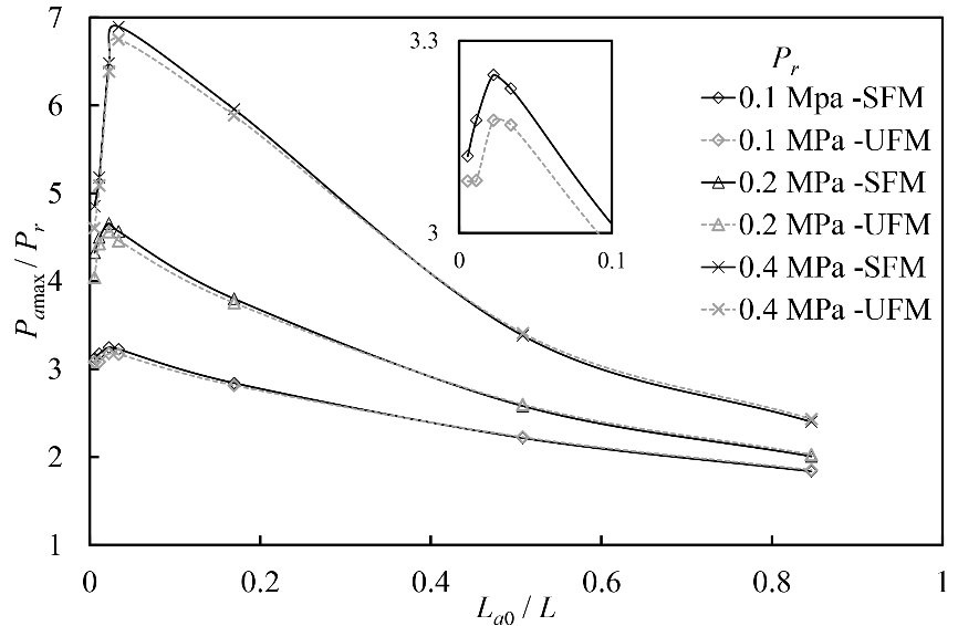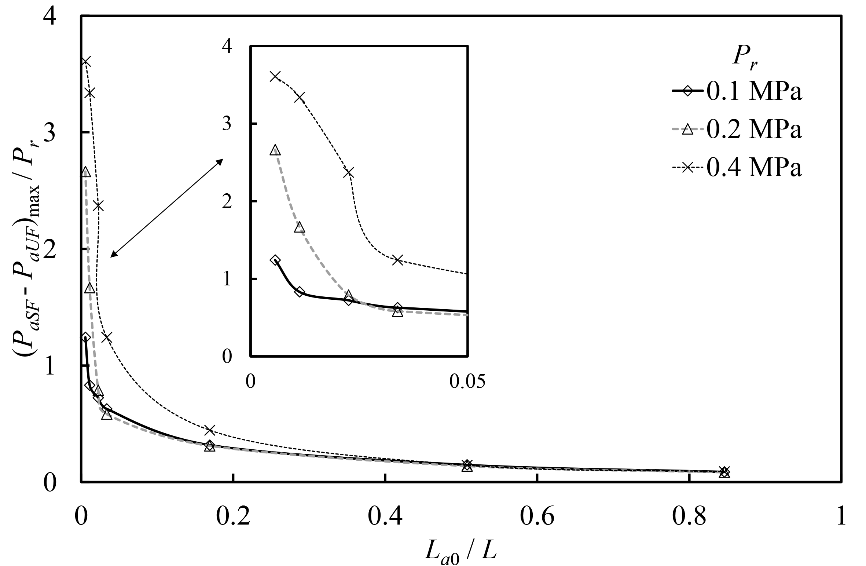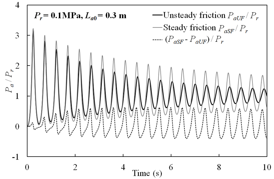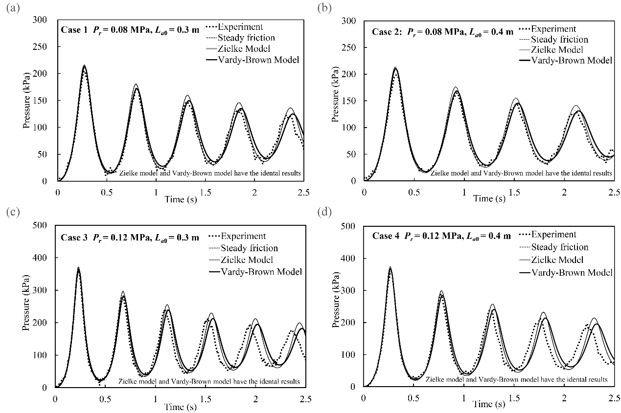 研究团队充分考虑了水流冲击滞留气团过程中水体弹性、动态摩阻及气团热力学特性对压力衰减的影响,建立了摩阻-能量耗散数学模型,揭示了动态摩阻对引发水气耦合的能量耗散机理。数值模拟和实验数据对比结果表明,所建数学模型能更准确地模拟实验压力波动曲线(图1)。以往恒定摩阻数学模型低估了压力峰值的衰减,系统压力的最大误差发生在第一个波动周期之后,且在初始气团含量较小和入口压力较高的情况下,数值误差较大;气团最大压力峰值的最大误差发生在初始气团体积的临界值附近,气体含量在2%-3%(图2)。Trikha-Vardy-Brown动态摩阻模型与基于卷积的动态摩阻模型相比,具有同样计算精度,且计算效率更高;改进的Brunone模型计算效率更高,同时保持了良好的数值精度。