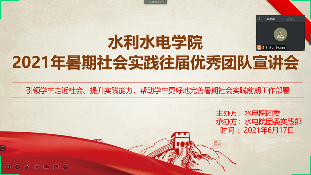 为加深同学们对实践具体过程的了解,帮助学生更好地完善暑期社会实践前期工作部署, 高辣文 团委实践部于2021年6月17日下午16:00在腾讯会议上举办了 高辣文 2021年暑期社会实践往届优秀团队宣讲会。本次活动邀请到3支往届优秀实践团队,分别来自不同项目类型,可以让同学们更好地了解不同项目类型的实践活动如何更好的开展。