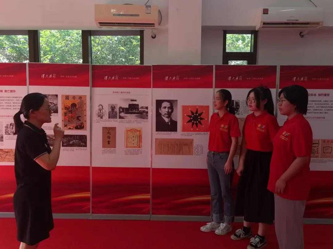 在海门区党校,与党校总负责人见面并交流后,实践团了解到海门区政府为庆祝建党百年,在党校内部场馆举办了党史图片特展,展馆内所陈列的展牌囊括了从“伟大开端”到“胜利的大会”等七个部分。实践团成员有幸在一名党校资深老师的带领下,参观了两大展馆,并得到了老师对于百年党史生动详细的讲解。