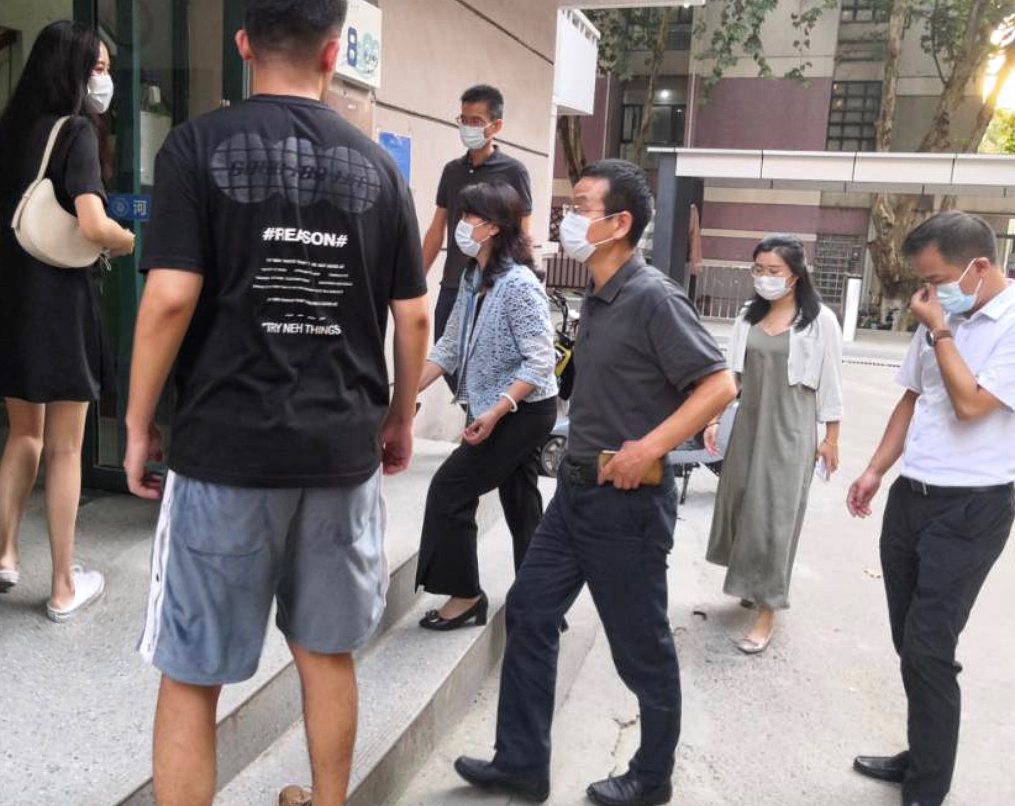 22日,老生返校当天下午,我院党委书记娄健、院长王媛、副院长王建、党委副书记王方来到西康路校区学生2舍、8舍、新疆馆,走访慰问已返校的2018级、2019级本科生。2018级辅导员姜帆、2019级辅导员帅雨婷陪同走访。
