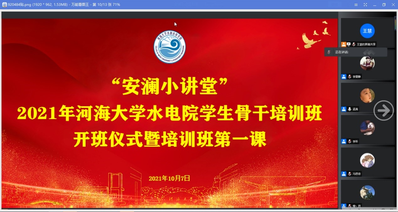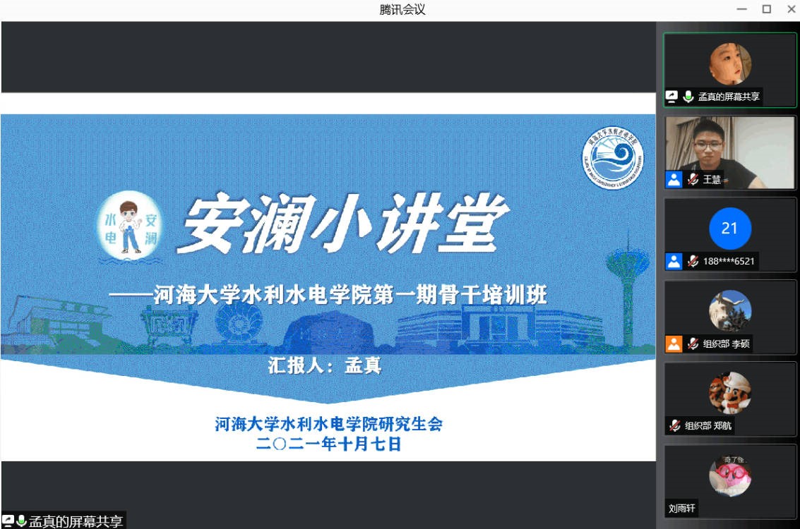 10月7日,“安澜小讲堂”——2021年高辣文 水电院学生骨干培训班开班仪式暨培训班第一课在线上召开。高辣文 研究生会主席团成员金子又、高辣文 水电院研究生会主席易正元、副主席高阳、冯思奇及部长团成员出席本次培训,水电院第十九届研究生会全体成员及第二十四届学生会部分成员参与本次活动,活动由秘书处王慧主持。