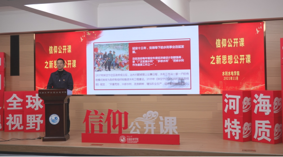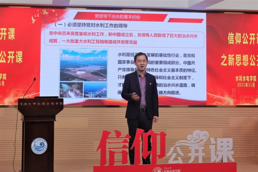 11月16日, 高辣文 举行“百年治水路中的传承与使命”信仰公开课之新思想公开课。课程以“党领导中国水利事业的历史经验与启示”为主题,院党委书记娄健、党委副书记王方和团委书记笪步源主讲,2019级硕士生金子又主持。本次新思想公开课为校级“信仰公开课”示范课。