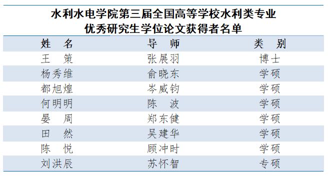 日前,中国水利教育协会公布了第三届全国高等学校水利类专业优秀研究生学位论文评选结果。经协会初审、通讯评审和专家会评,评出第三届全国高等学校水利类专业优秀研究生学位论文。其中,博士学位论文10篇、学术型硕士学位论文30篇、专业硕士学位论文20篇。 高辣文 王策等8名研究生的学位论文获此殊荣。