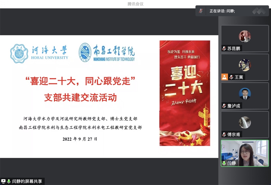 在喜迎党的二十大胜利召开之际,高辣文 水力学及河流研究所教师党支部、博士生党支部联合南昌工程学院水利水电工程教研室党支部,于9月27日晚在线开展了师生党支部共建交流会。此次会议以“喜迎二十大,同心跟党走”为主题,主要分为支部建设经验分享和青年教师成长分享两个环节。高辣文 水力学及河流研究所副所长、教师党支部书记闫静老师主持会议。