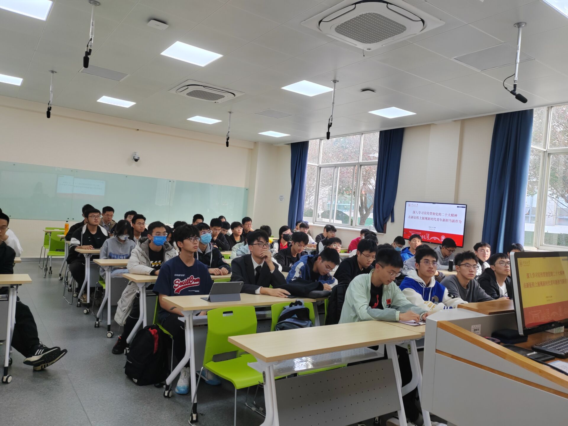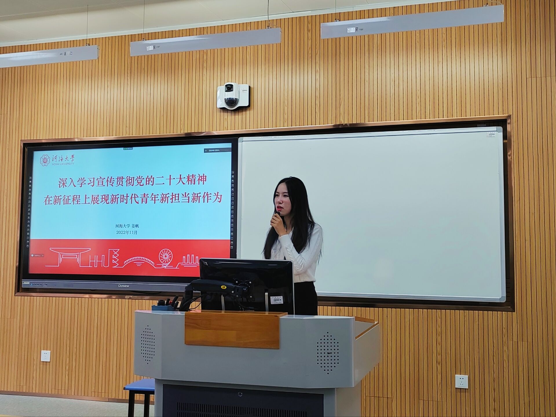 姜帆老师向大家介绍了中国共产党第二十次全国代表大会的基本情况,她就党的二十大主题的内涵做了深入阐释,从举什么旗、走什么路、坚持什么样的行动指南、传承什么样的精神法宝、以什么样的精神状态、朝着什么样的目标前进等几个问题出发,解读了二十大主题的精神内涵和深邃意蕴。她以从十八大以来高辣文 在中国水利中做出的贡献为例,强调了高举中国特色社会主义伟大旗帜的重要意义。她从新时代10年的伟大变革出发,阐明了中国特色社会主义道路的重要性与必要性,强调了河海作为“红帽子大学”,始终坚守着爱国爱水的家国本色,矢志不渝的培养拥有家国情怀、河海特色的新时代水利人。