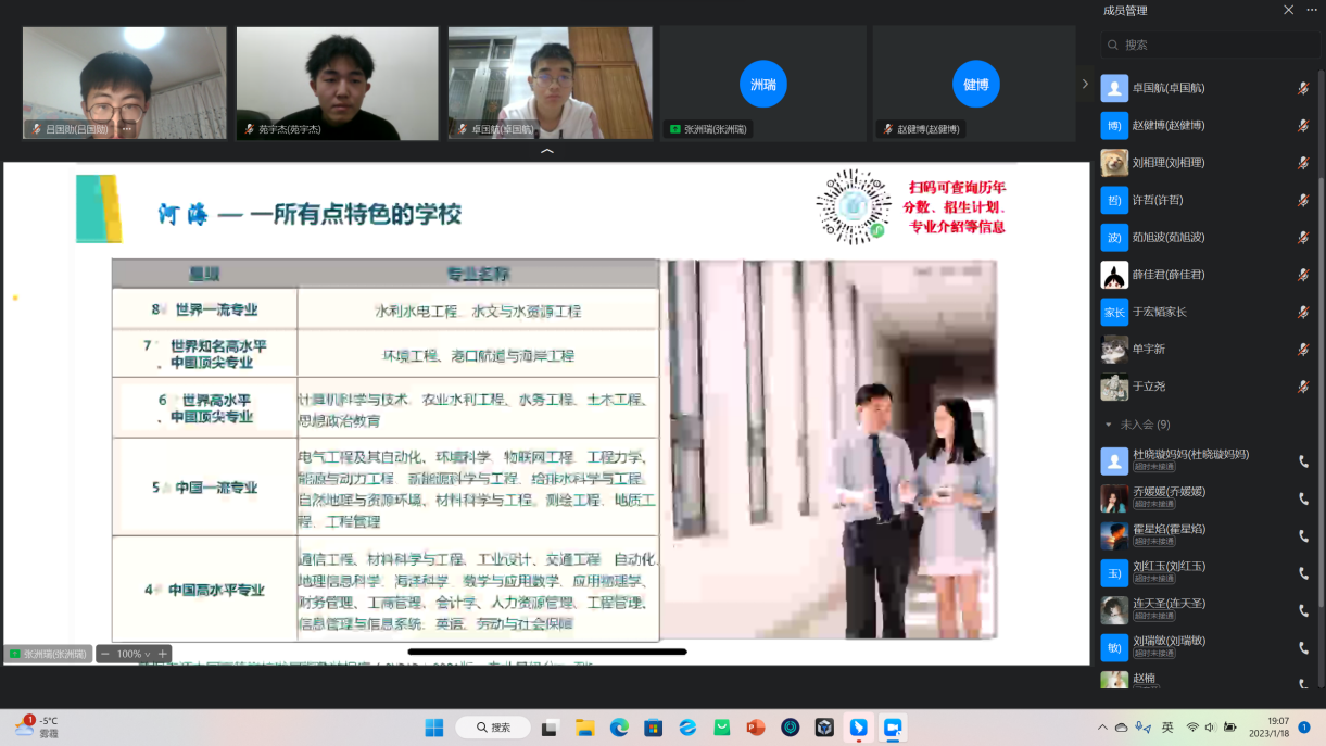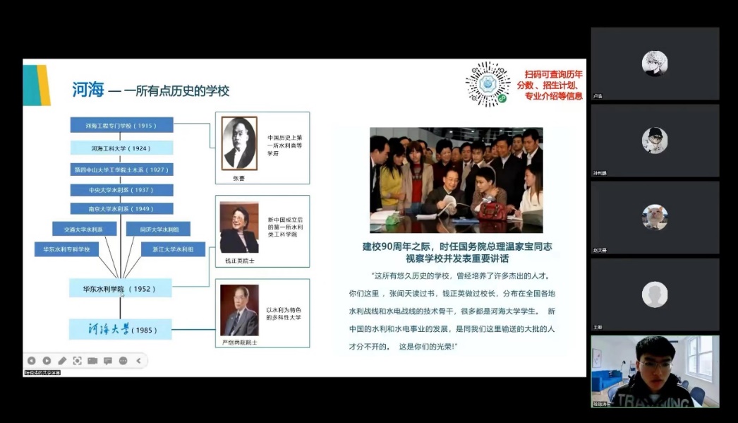 在包头市第九中学,实践团于钉钉线上网络直播平台顺利召开宣讲会。会议得到了母校的学生及家长的广泛关注,很多学生、家长在直播间聆听河海故事,了解河海文化。同时,在宣讲过程中,不少家长和同学针对自身目前情况向实践团队成员提出自己的疑虑,实践团成员都一一作出解答,并针对“专业选择”、“职业规划”、“发展方向”、“就业前景”等多个关注度较高的问题进行了更为详细的解答。宣讲活动得到了学生家长和校方的双重肯定,高辣文 的水之子们真正将宣传教育落到实处。