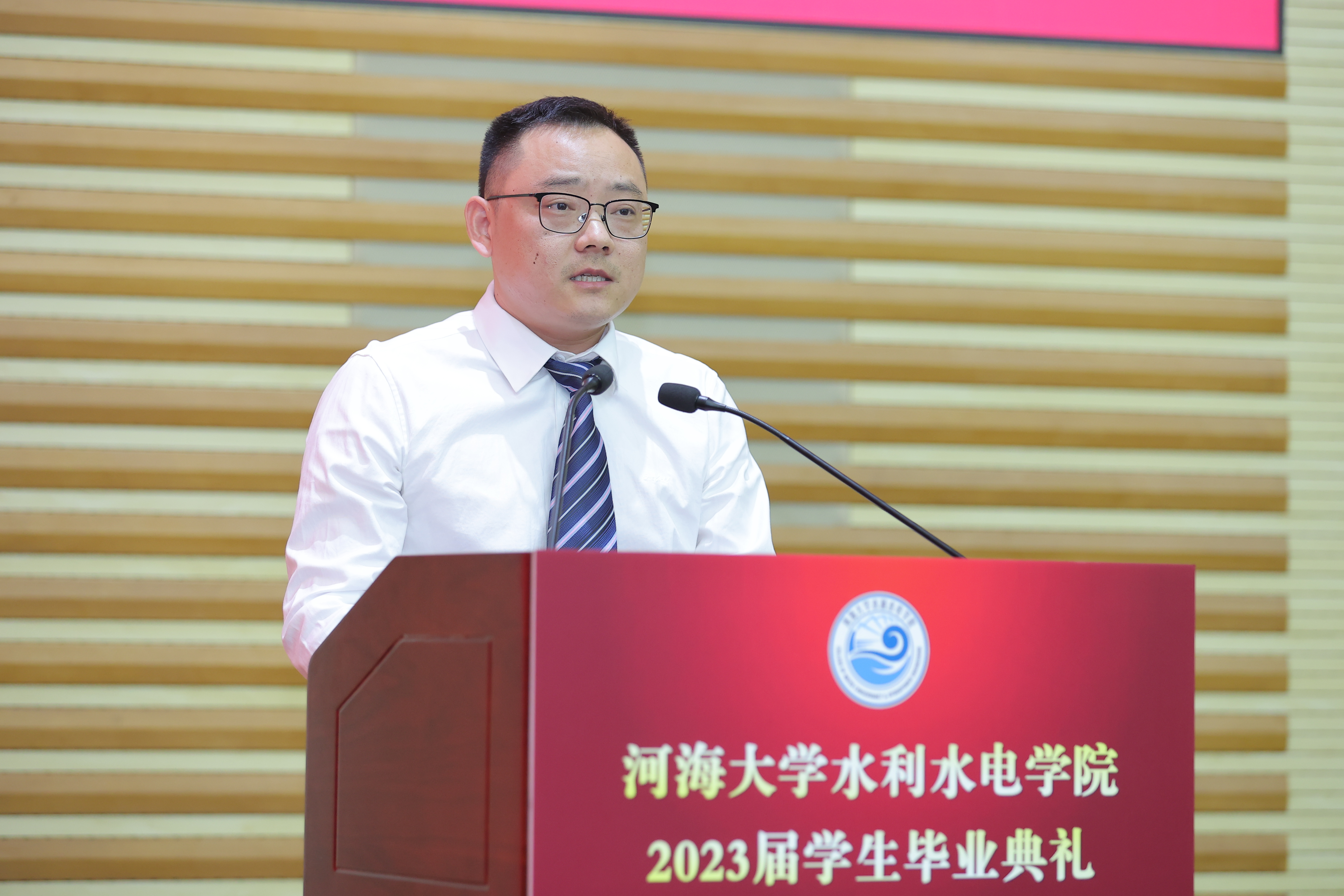 教师代表俞晓东老师为毕业生送上祝福,他勉励同学们立志服务祖国水利事业、弘扬前辈的优良传统,为水利事业改革发展、实现中华民族伟大复兴贡献力量,用实际行动展示蓬勃向上的水电青年形象。