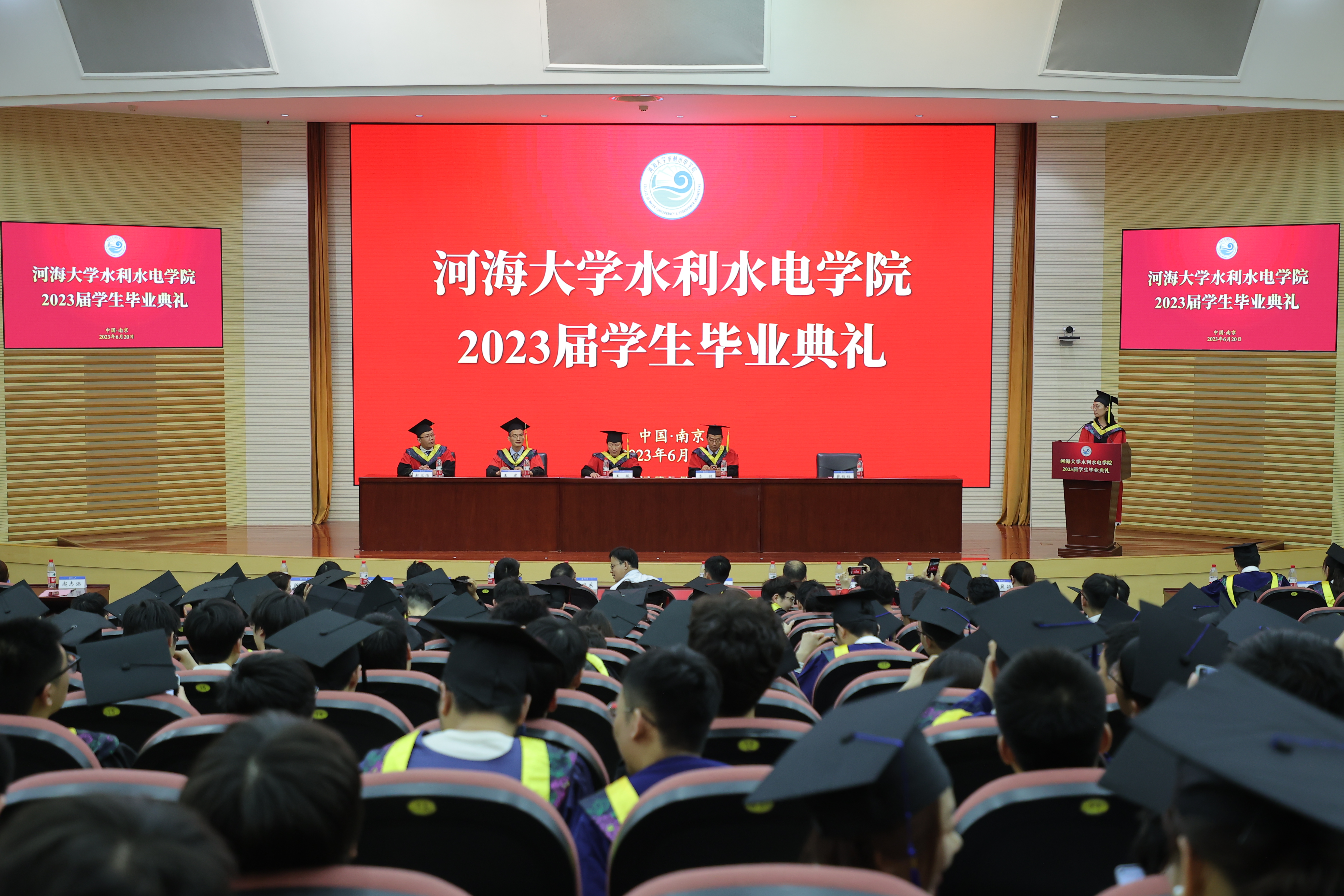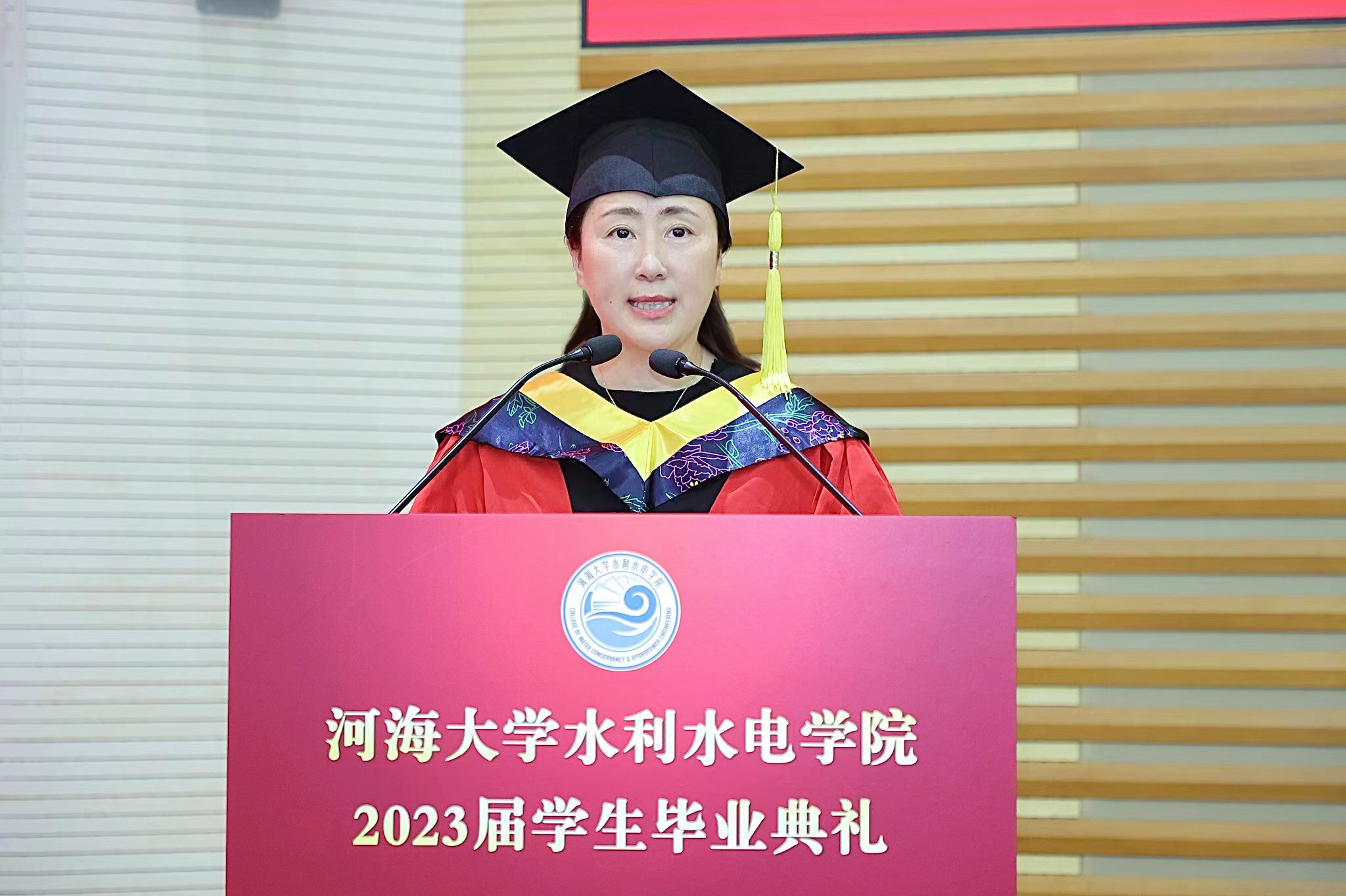 王媛发表致辞,她代表全院师生向顺利完成学业的全体毕业生们表示最热烈的祝贺,向辛勤付出的教职工老师以及学生家长们致以衷心的感谢。王媛对全体毕业生提出三点期望:一是要心怀“国之大者”,坚定治水兴邦远大理想,传承河海人的家国情怀和使命担当。二是要守正创新,绽放熠熠生辉的水电光彩,坚守水利人的敢闯敢试的进取精神和职业操守。三是要饮水思源,赓续奋斗勇立时代潮头,描绘属于自己的水利蓝图。她希望,毕业生同学们要将新时代水利精神沁润心田,在未来的人生路上勇做开路先锋和事业闯将,肩负起水电青年的时代使命,秉河海之魂、承凌云之志、做擎天之柱、成济世之才,在民族复兴的征程中踔厉奋发、勇毅前行,投身到社会主义现代化建设的火热实践中去。