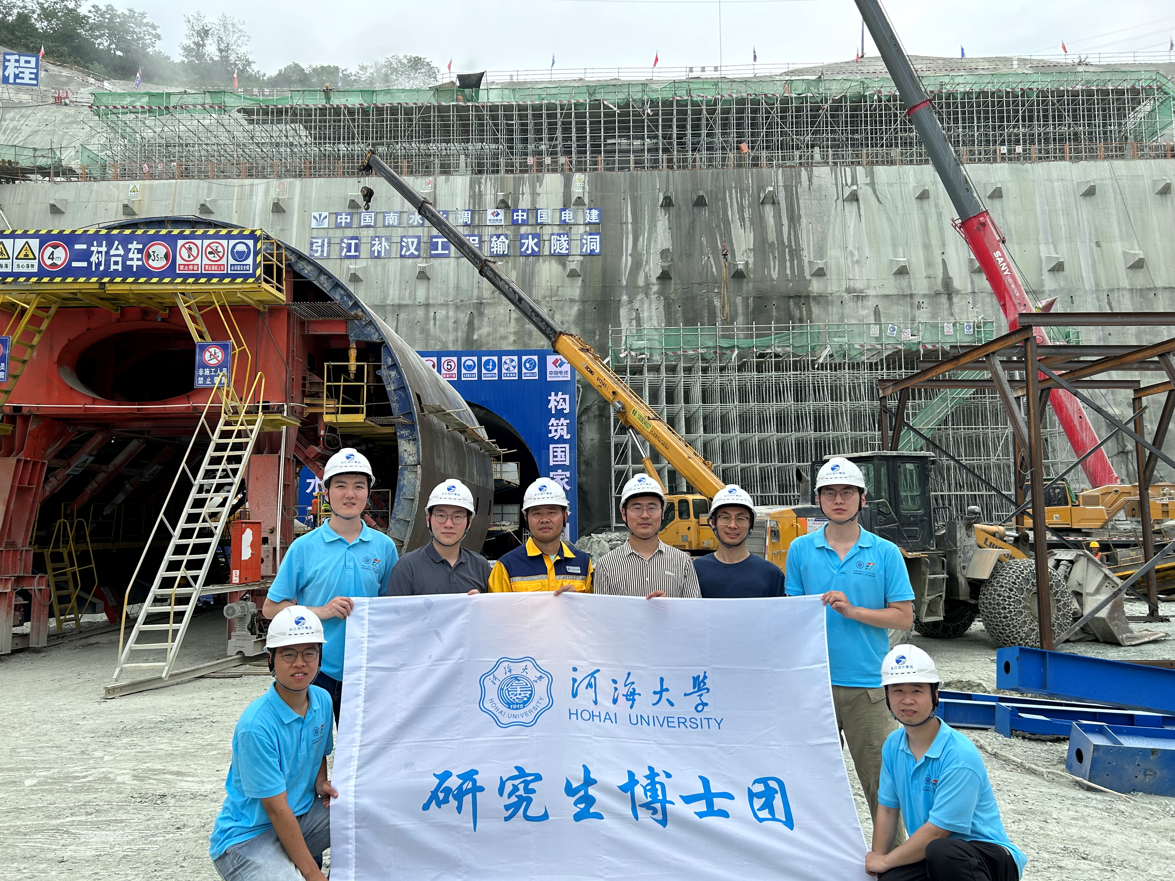 在丹江口大坝下游汉江右岸安乐河口,博士团跟随长江设计集团引调水院余义华主任和武松博士进入引江补汉工程出口段主体隧洞内调研,观察了输水隧洞钻爆法作业面衬砌支护施工过程,了解了隧洞开挖在面临强岩爆、突泥涌水、软岩大变形等问题时的具体处置方案。在桐木沟检修交通洞,博士团深入隧洞内近500m,进一步观察了沿线Ⅲ类和Ⅳ类围岩所采取的不同支护措施。之后博士团还观摩了引江补汉工程出口段数字孪生智能建造中心,学习了“智慧工地”、“数字孪生建设”的具体实践。