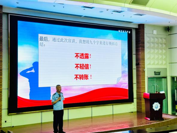在宣讲活动的最后,娄警官用“不透露!不轻信!不转账!”九个字总结了不被诈骗的秘诀。让我们一起行动起来,共同提高防骗意识,共同守护我们的财产和生命安全!(文、图/康峻瑞)