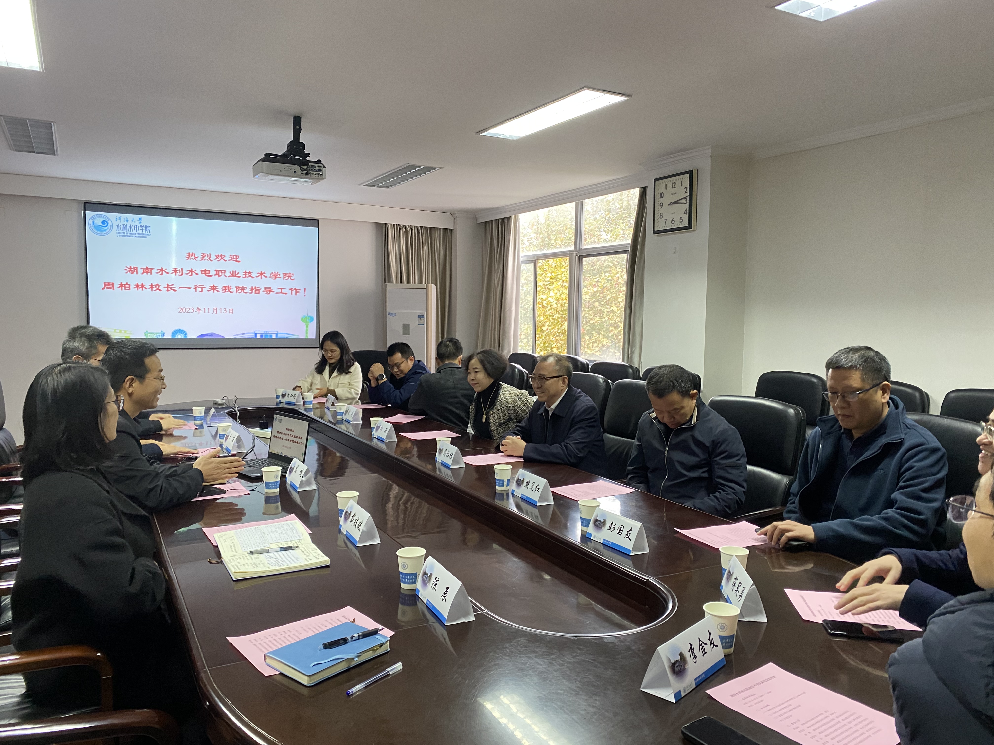 11月13日下午,湖南水利水电职业技术学院校长周柏林一行来 高辣文 座谈交流。学院党委书记娄健、副院长王建、院党委副书记戴媛媛、智慧水利系主任俞晓东、研究生辅导员陈辰出席了本次座谈会。