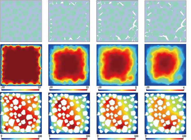 图2 冻融作用下模拟结果:内部裂缝、温度场、孔隙水压分布
