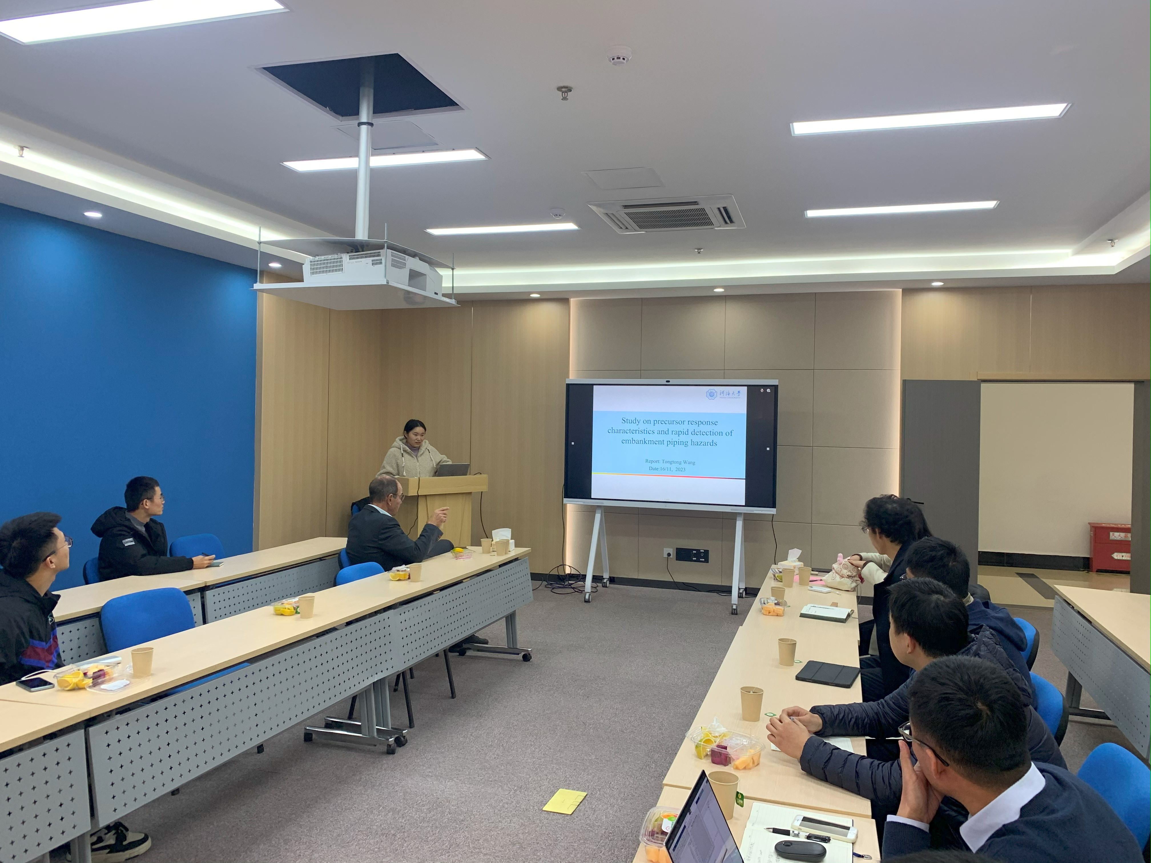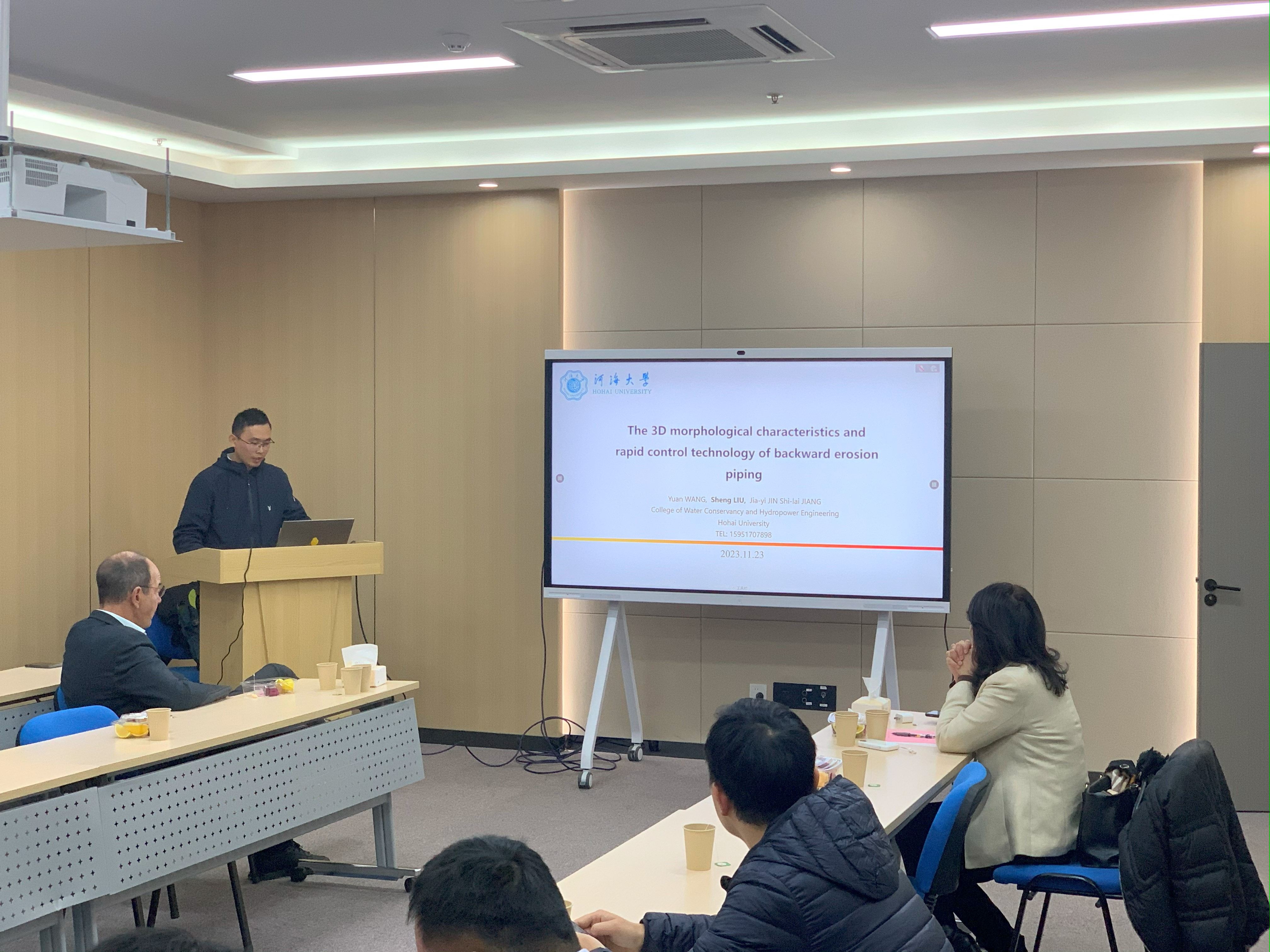巩佳琨副教授、刘胜博士和王佟佟博士生分别汇报了“基于泡沫流体的堤防土体渗透破坏应急控制技术”、“后向侵蚀性管涌三维形态分析”和“堤防管涌前兆信息辨识和快速探测方法”等方面的研究进展。