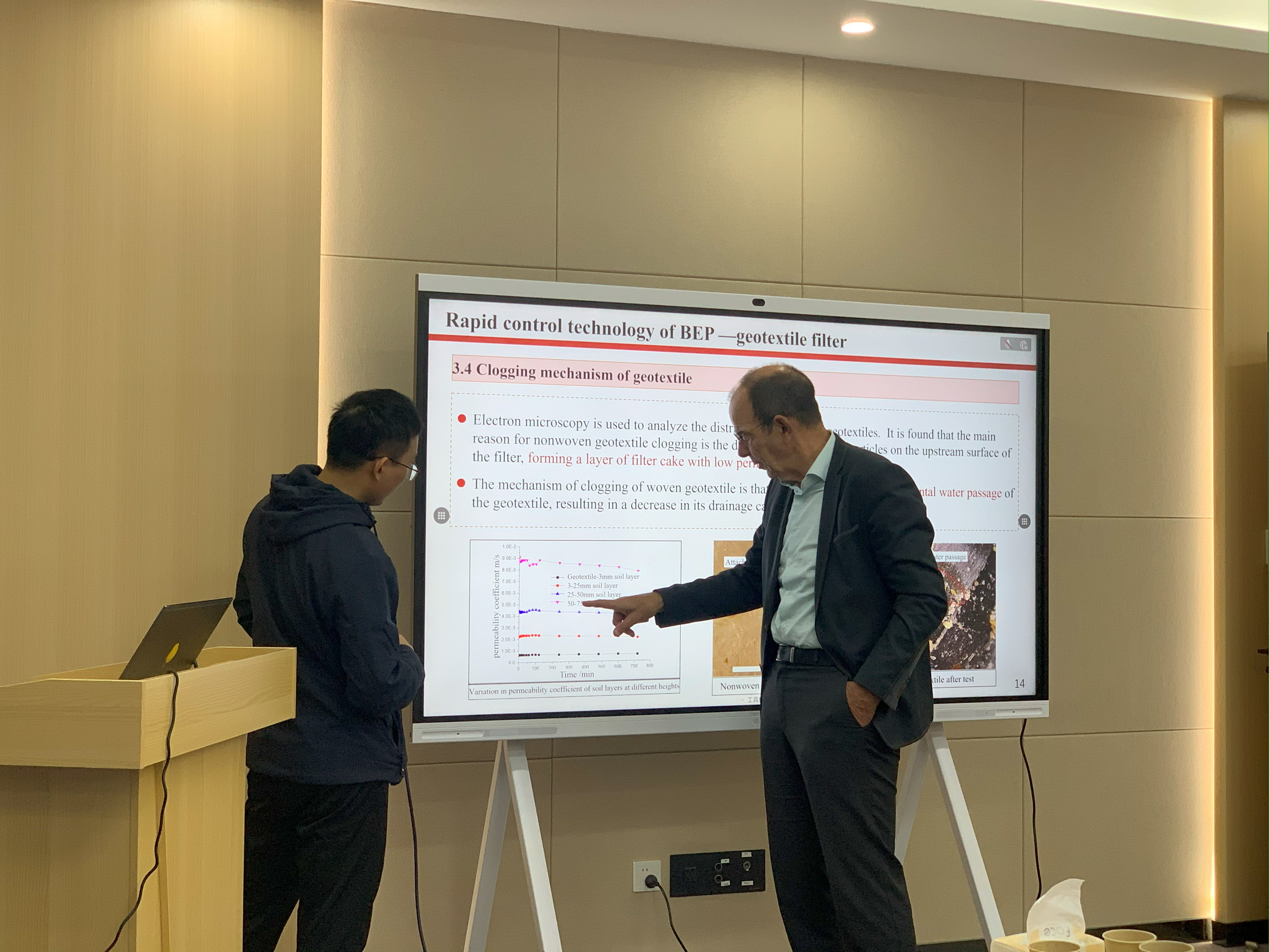 在交流研讨环节,青年教师和研究生与Adam Bezuijen教授围绕堤防渗透破坏问题开展了热烈的学术互动,Adam Bezuijen教授分享了他对相关问题的见解,并对青年学者未来的研究提出了建议。