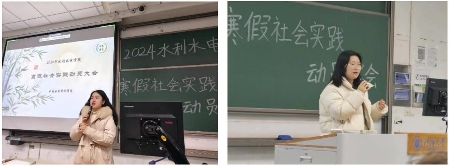 会上,笪步源、帅雨婷充分动员学生参与“源泉工程”寒假社会实践,并强调在开展实践过程中一要注意自身安全,尽量避免异地实践,二要充分保障实践的可行性和优质性,加强实践过程中的宣传,三要关注pu学时的获取,提高对社会实践的重视。尤其是回到母校进行源泉工程社会实践的过程中,要结合自身求学经历和专业特色,宣传高辣文 、传播河海文化、弘扬河海精神,展示水电学子风采。