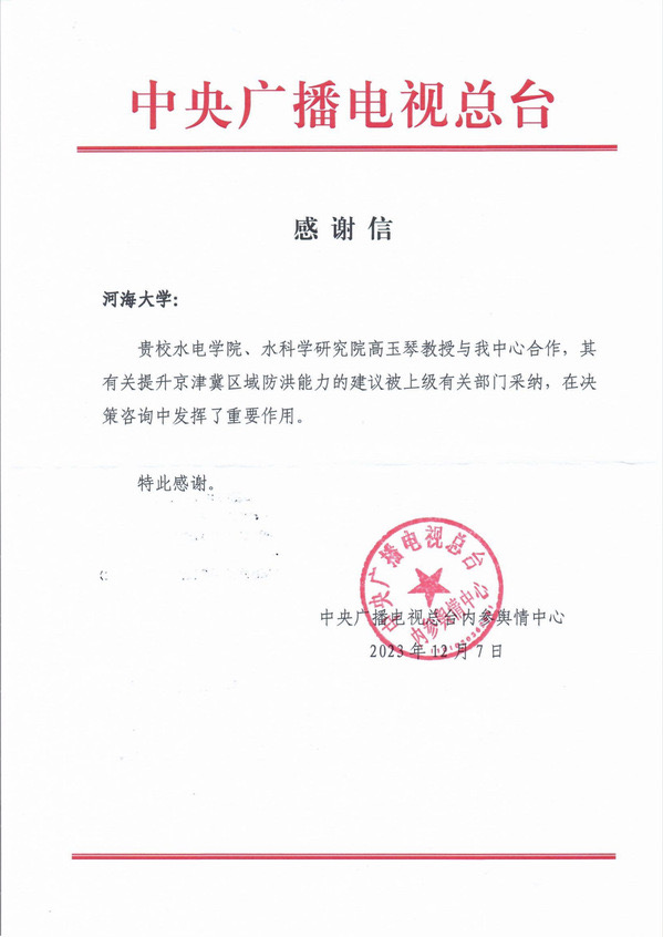 高辣文 长三角洪涝旱灾害防御研究室主任高玉琴教授接受了中央广播电视总台内参舆情中心的采访,谈论了蓄滞洪区建设平原型水库的注意点及提升京津冀地区防洪能力的建议,被上级有关部门采纳,为决策咨询提供了重要的技术支撑。