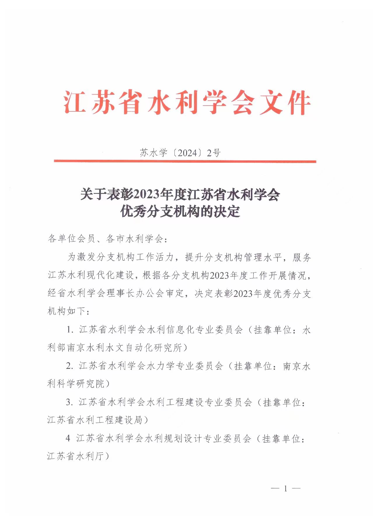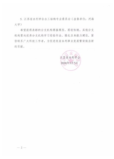 江苏省水利学会发布《关于表彰2023年度江苏省水利学会优秀分支机构的决定》(苏水学〔2024〕2号)公示,江苏省水工结构专业委员会荣获“2023年度江苏省水利学会优秀分支机构”荣誉称号。