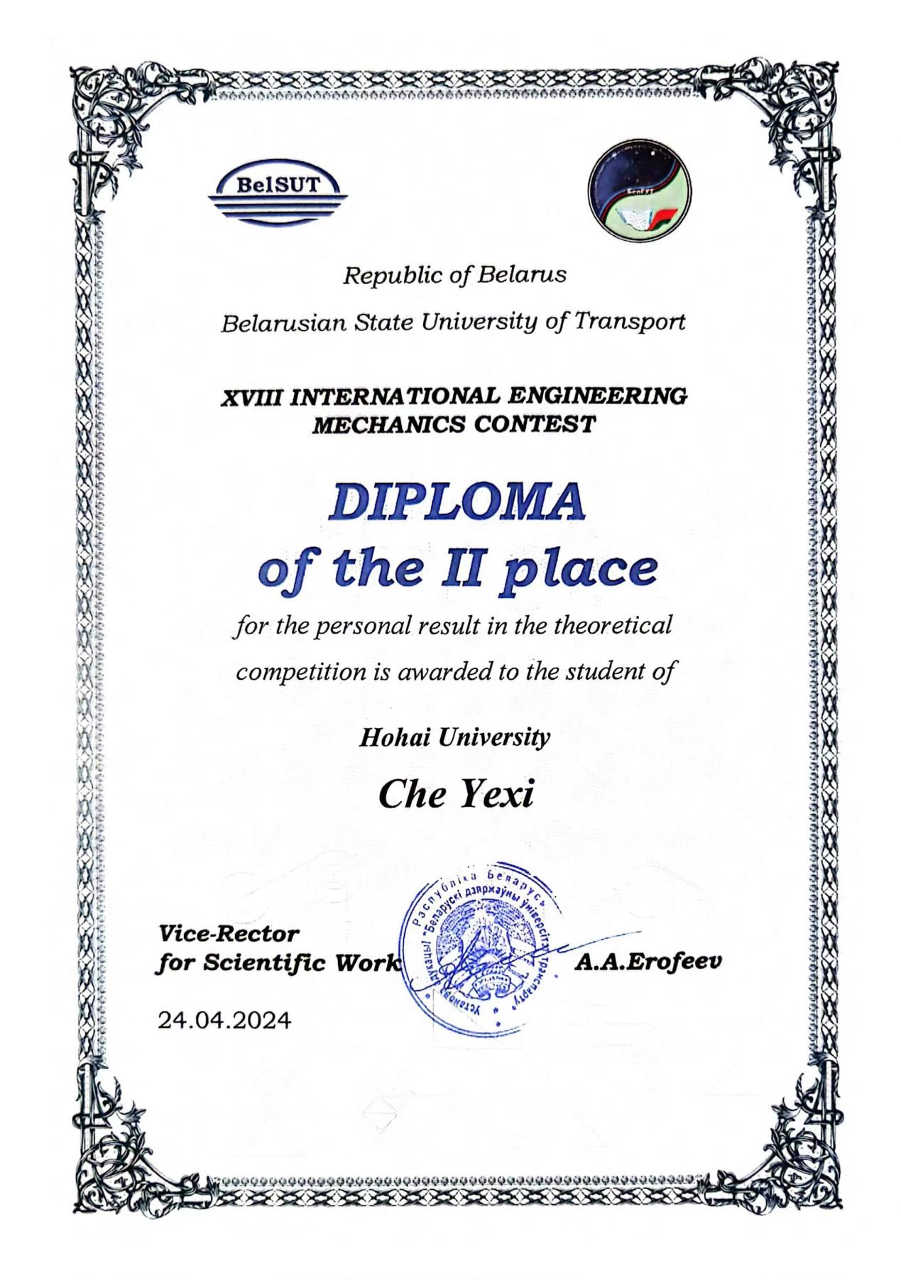 2021级本科生车烨晰同学参加了第十八届国际大学生工程力学竞赛,斩获个人赛银牌1枚。该赛事在白俄罗斯戈梅尔的白俄罗斯国立交通大学举行,来自中国、俄罗斯、白俄罗斯等多个国家共20余所高校100余位师生代表参加竞赛。据了解,去年12月车烨晰通过由高辣文