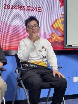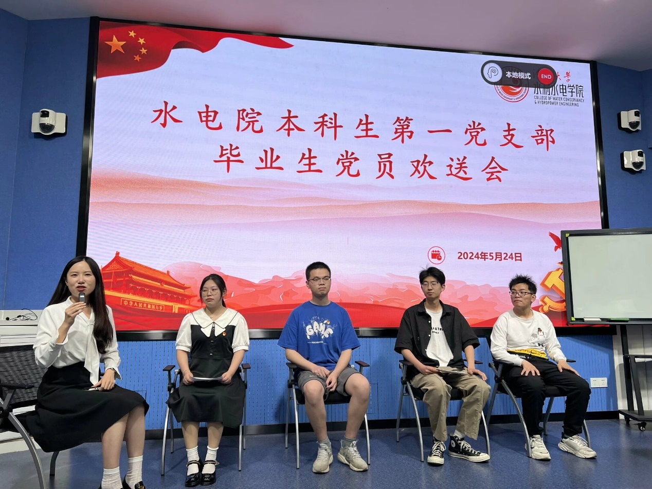 毕业生党员任嘉欣、万扬、黄冰玺、王刚鹏分别分享了大学期间在本科生第一党支部这个温暖、团结、上进的大家庭中的成长经历。任嘉欣同学回顾了自己在党支部任副书记一职的工作经历,阐述了党支部对其在考公过程中起到的巨大帮助和积极影响,表达了在未来的工作阶段也将继续脚踏实地,发扬水电精神。刚鹏分享了自己在日常学习规划等方面的经验总结与成长感悟,对本科生第一党支部的帮助和培养表示诚挚的感谢,未来也将明确自我定位,不忘初心,永葆初心。