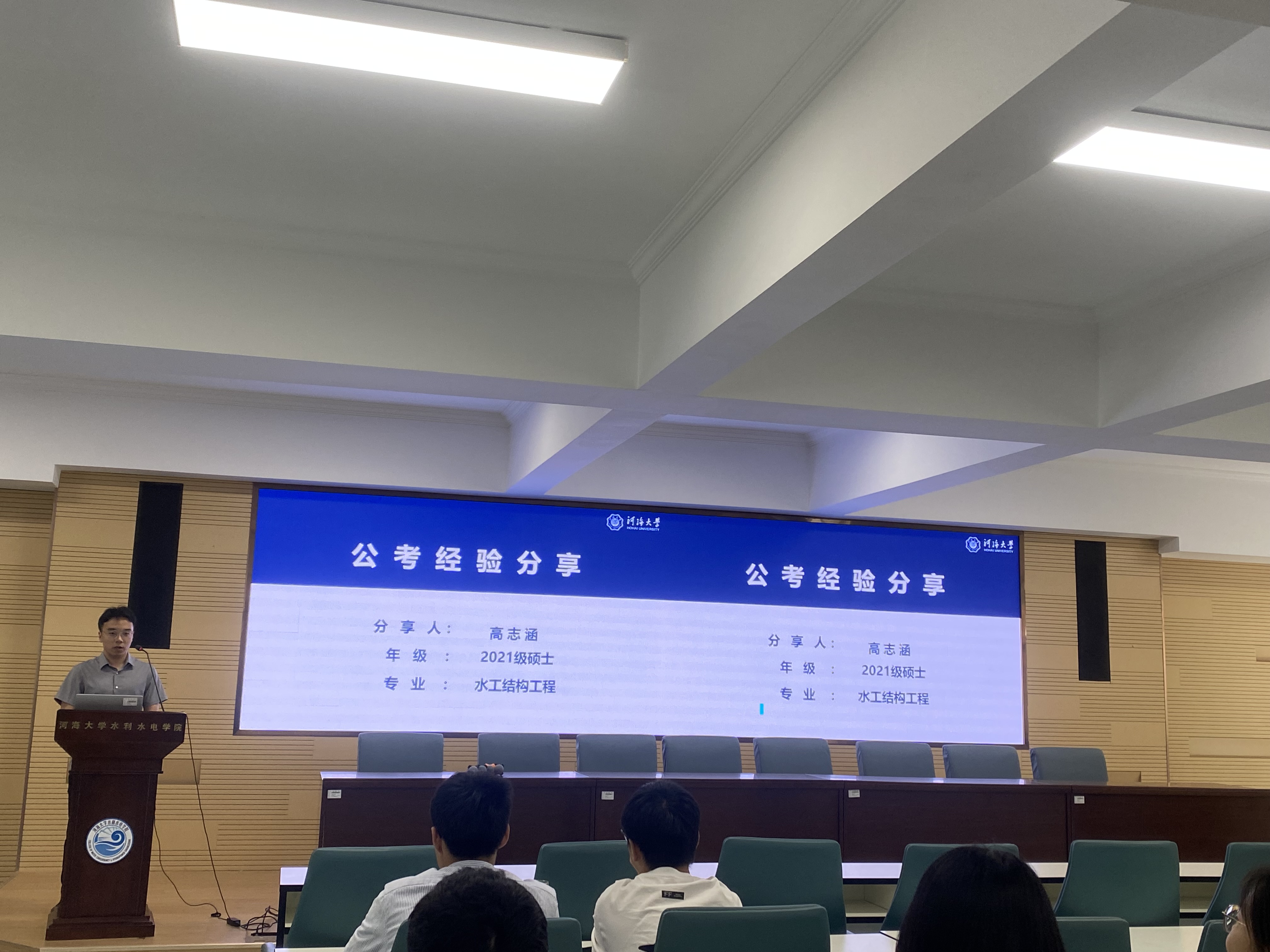 高志涵同学以“公考经验分享”为主题,向学弟学妹们介绍了国家公务员考情、岗位选择要点、各环节备考经验以及时间安排。系统地讲解了 高辣文 水利工程一级学科可以报考的优势岗位、公考笔试面试的复习技巧,并详细分析了研三一年毕业论文与公考复习的时间安排。高志涵同学建议有意考公的师弟师妹不因考公影响毕业论文相关工作,秋招和公考两手抓,合理规划时间,全身心投入学业与求职,并祝愿大家能够旗开得胜,一战成公。