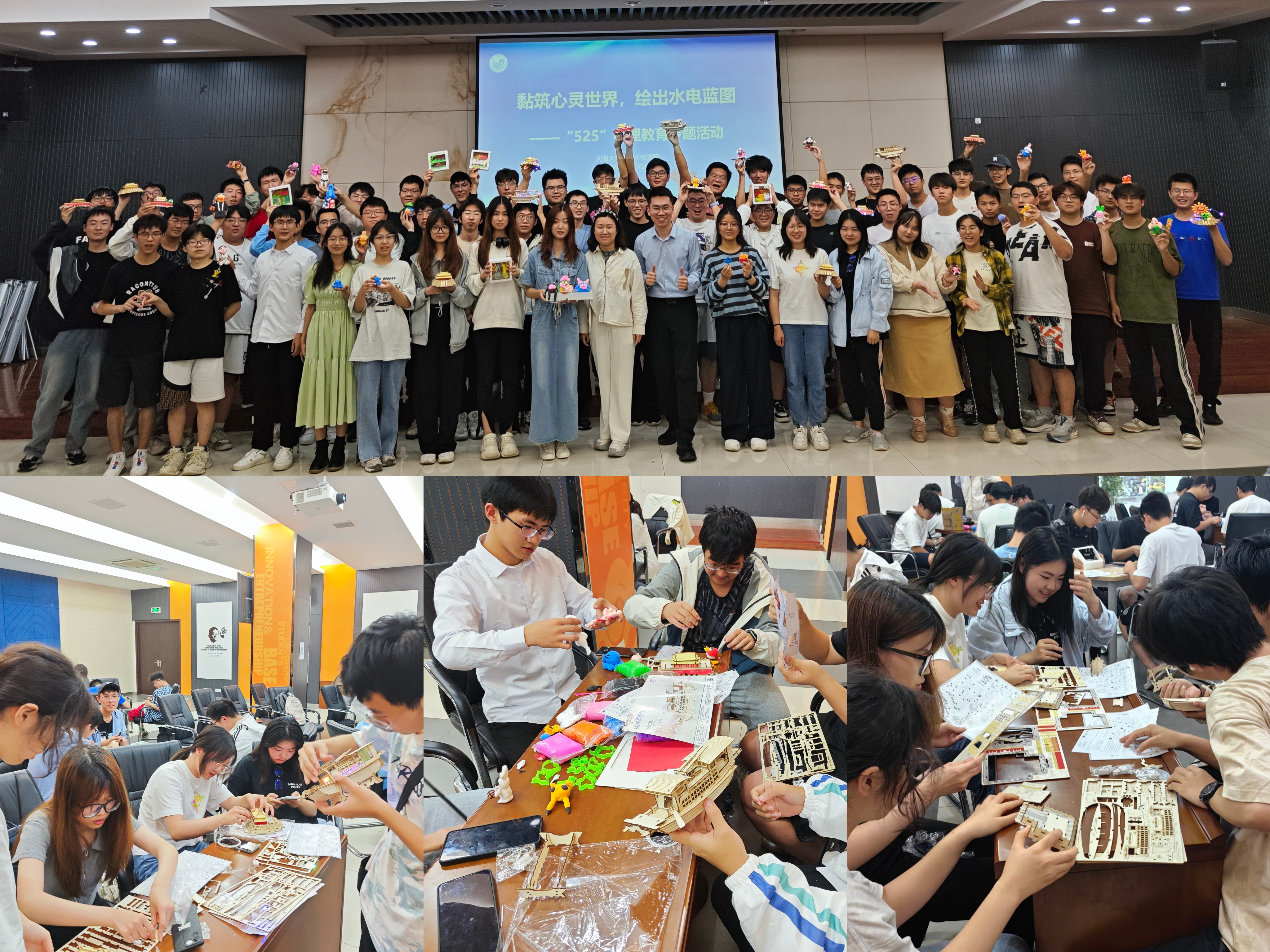5月30日,为营造积极关心关注、支持参与学生心理健康教育的良好氛围, 高辣文 开展“黏筑心灵世界,绘出水电蓝图”心理健康主题活动,通过心理讲座和艺术创作的方式,提升学生心理健康知识水平和素养,促进学生身心健康发展。活动邀请高辣文 心理中心专职教师、咨询师靳易老师主讲,23级辅导员帅雨婷、21级辅导员侯开智和近百名23级本科生参加。