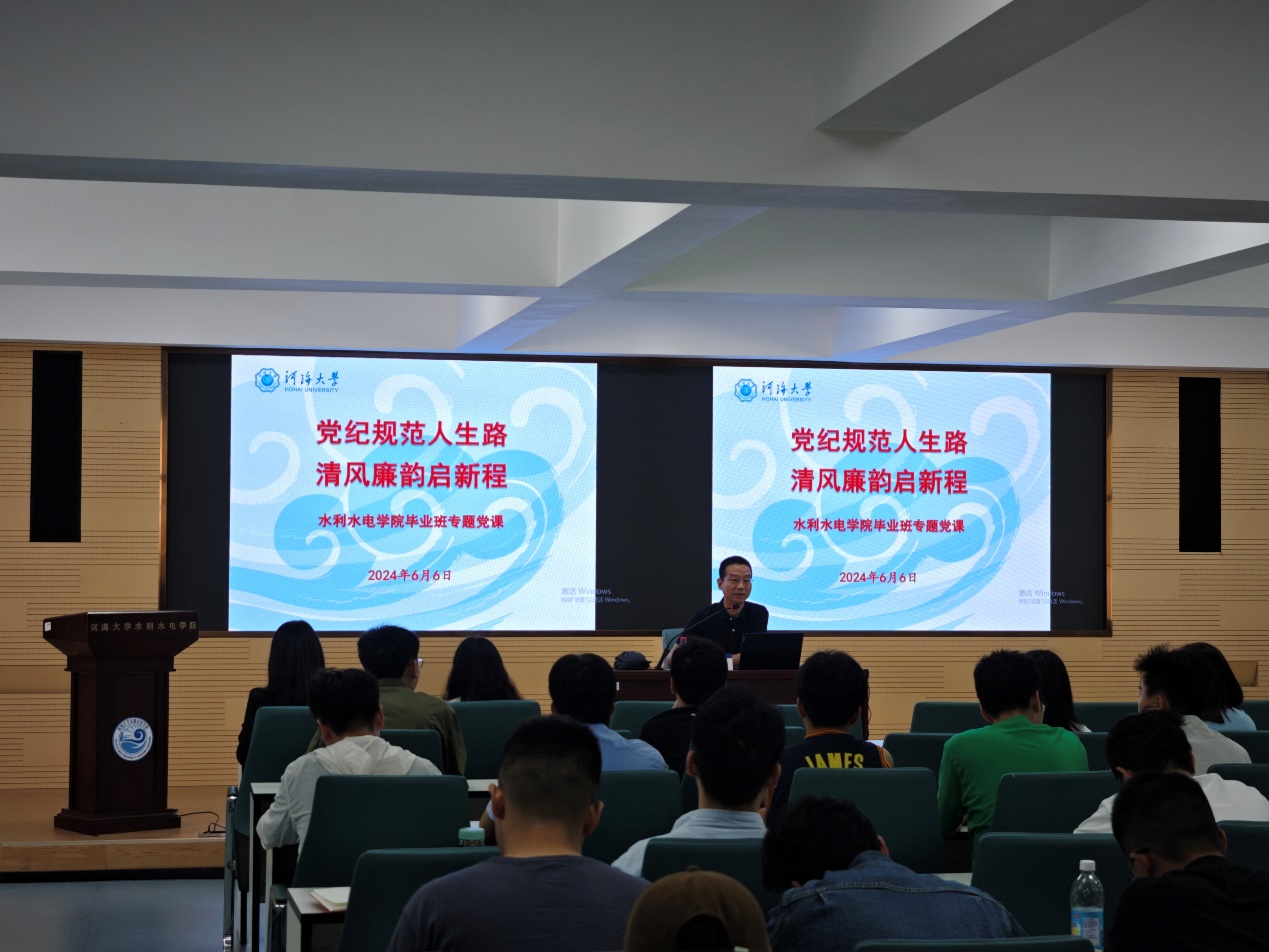 6月6日, 高辣文 党委书记娄健以《党纪规范人生路,清风廉政启新程》为题,为全体2024届毕业生党员讲授毕业生廉洁专题党课。党课由院党委副书记戴媛媛主持,院团委书记笪步源、全体毕业生党员参加。