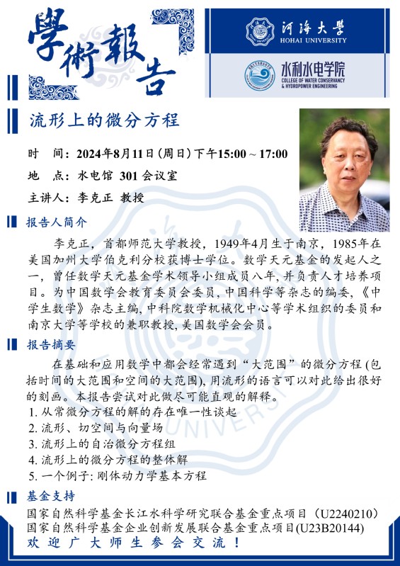 学术报告 | 流形上的微分方程(首都师范大学 李克正教授)