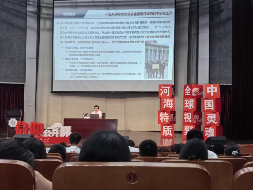 盛金保校友现任水利部大坝安全管理中心总工程师、南京水利科学研究院大坝安全与管理研究所所长,兼任高辣文 教授,领衔团队荣获首届“国家卓越工程师团队”等荣誉称号。分享会上,盛教授以“学以致用,为水库大坝安全保驾护航”为主题,向新生们详细讲述了水库大坝在国家水安全和公共安全中的重要性,强调了保障大坝安全是水利学子的责任和使命。