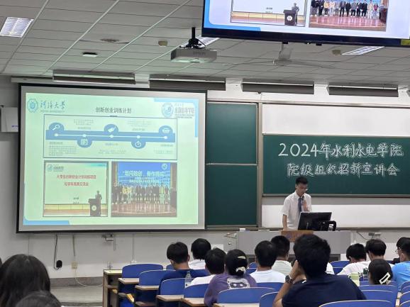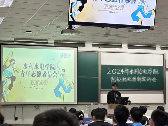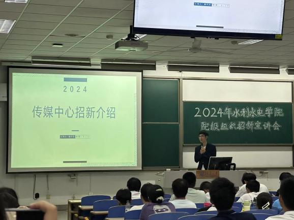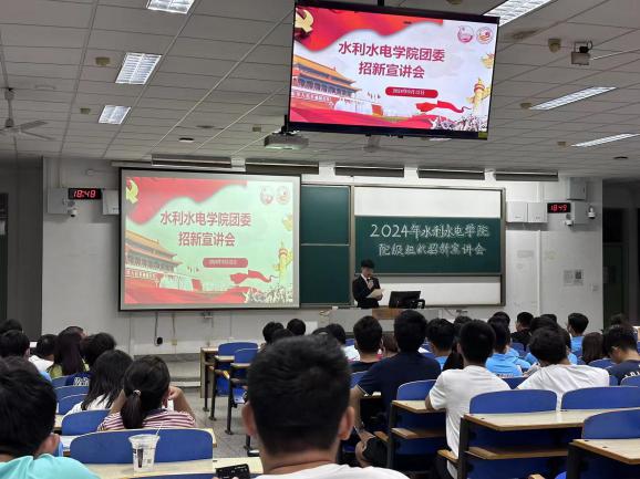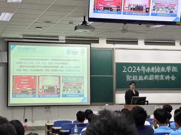 院团委副书记王尧首先为在场的新同学们讲解了报名表填写以及面试提交的具体流程,以此希望新同学们能够正确、高效地递交报名表并向自己心仪的学生组织报名。并就学院团委的有关情况展开宣讲。宣讲过程中,他直观全面介绍了院团委三大部门的责任职能与具体工作内容,着重强调了团委在提升学生综合素质、提供展示自我平台方面的重要作用。通过分享过往活动的成功案例,展示了团委以基础团务为核心,素质拓展为抓手,综合素质全面发展的特点与特色,进一步激发了24级新生加入水电院团委的兴趣与热情,为加入院团委提升综合素质,展示自我、提升自我,打造品牌贡献出自己的一份力量。