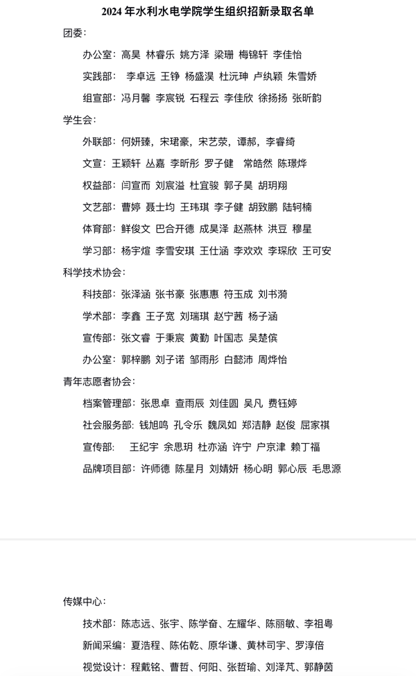 近期,学院各学生组织展开招新面试,同学们踊跃参与,展示属于自己的优点和长处,最终录取人员名单如下。