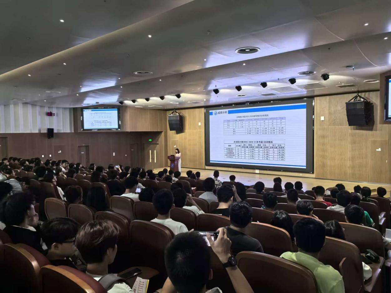 帅老师首先对“我们的现在”展开学情分析,针对专业平均情况和各班级情况进行逐一解析,鼓励目前领先的同学不忘初心,继续前行,也鞭策稍有落后的同学打起精神,奋起直追。同时,她表扬了大一学年获得各项学科竞赛奖项及荣誉的同学,并以此激励其余同学,敢于争先,勇于争先。帅老师就“我们的底线”进行毕业须知提醒。从培养方案着手,帅老师提醒同学们关注自己的系统,进行学分自查;从两证获取说起,帅老师警醒同学们诚信考试,不违纪不作弊,积极关注自己的课程重修补修情况。未来已来,帅老师强调了“我们的追求”,对同学们未来的发展进行分类规划。帅老师将本科毕业后的去向分为就业篇和升学篇,在就业篇里列出水电学子能参加的各项岗位并逐一介绍,在升学篇里面向保研、考研和境外升学做不同的提醒,扫去了同学们心中对未来的迷茫。