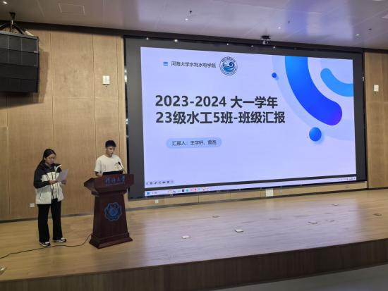 2023级水工三班班长贺淼、团支书孙鹤围绕“乘风破浪,不负韶华”主题进行汇报。水工三班的同学们始终保持积极向上的态度,班级凝聚力的提升让同学们在学习中相互支持,共同进步。