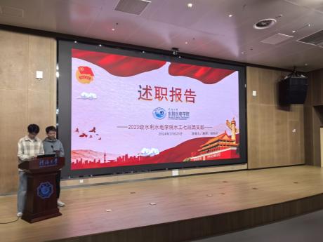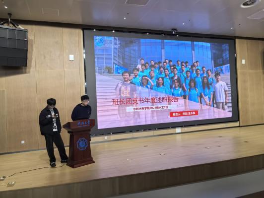 2023级水工六班班长赵一凡、团支书李卓烨围绕“水工六班23年度班长团支书述职”主题进行汇报。他们以坚定的领导力和出色的沟通能力,成功团结班级成员,创造了良好的学习氛围。
