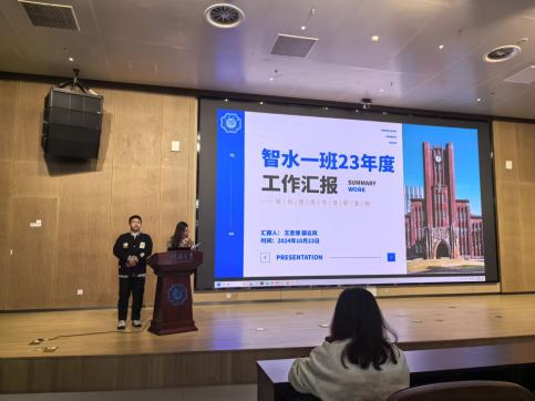 2023级智水二班班长苏宇然、团支书吕珏稞围绕“智水二班年度回忆”主题进行汇告。五育并举,百花放;砥砺前行,创辉煌。智水二班始终关注每位同学的需求,积极组织活动,让每个人都感受到归属感和团队的温暖。