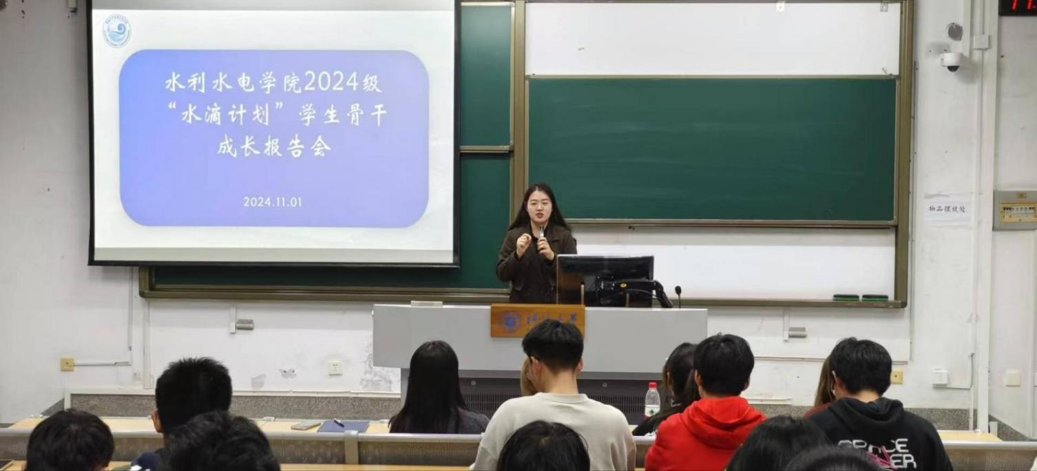 开展2024级“水滴计划”学生骨干成长报告会,旨在对近期学生工作进行总结、提升与思考,强化2024级学生骨干自我服务、自我管理、自我教育的综合成长,2024级全体年级委、班长、团支书参加,报告会由院团委书记、2024级辅导员笪步源主持。