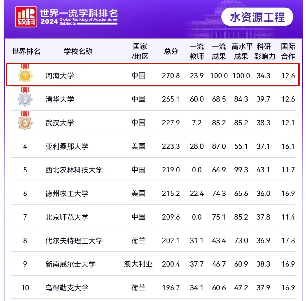 “水资源工程”学科自2022年以来蝉联全球第一。
