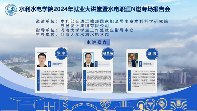 专业导师、水电院副院长赵兰浩,生涯导师、苏邑设计集团常州分院院长、东南大学校外硕士生导师赵博,企业导师、南京水利科学研究院工程师张宇,出席本次报告会并授课。