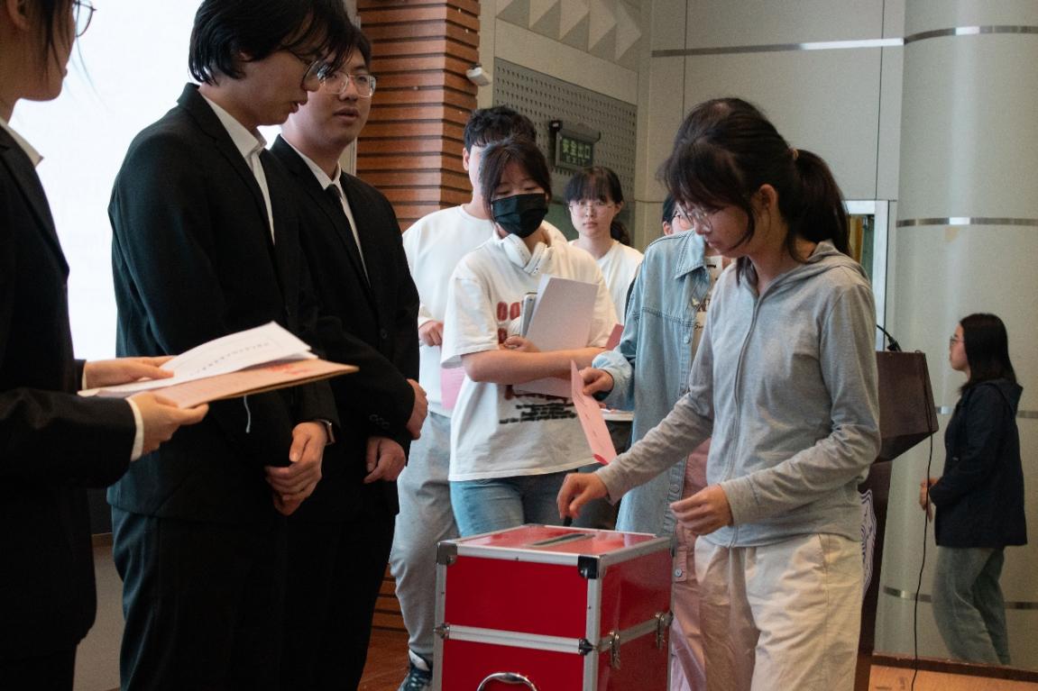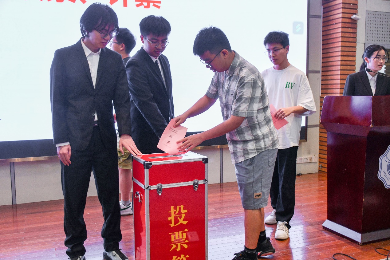 六位主席团候选人依次发表竞选宣言,大会投票选举产生了第二十八届水电院学生会主席团成员。经过现场投票,2022级马刘亦、2汤雨诺、李浩磊当选新一届学生会主席团成员。