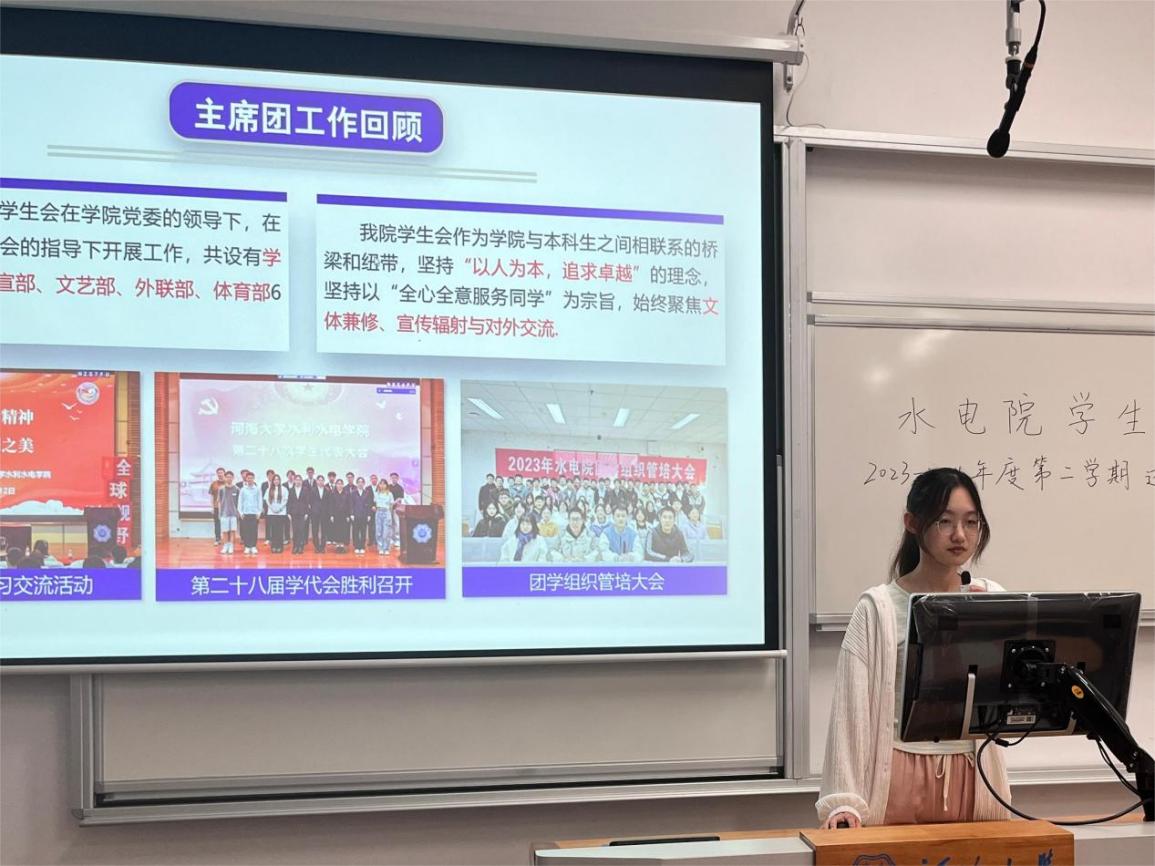 首先由学生会各部门负责人进行述职。文艺部、文宣部、外联部、权益部、体育部、学习部的部门负责人依次作述职报告,以“水文化”系列活动、院体育文化节、乐水学堂、“新生杯”系列活动、“河海杯”系列比赛等学生会品牌活动为切入点,向老师和主席团汇报了各部门活动开展上的具体成效,总结了所在部门的不足之处,提出了部门未来的工作展望。