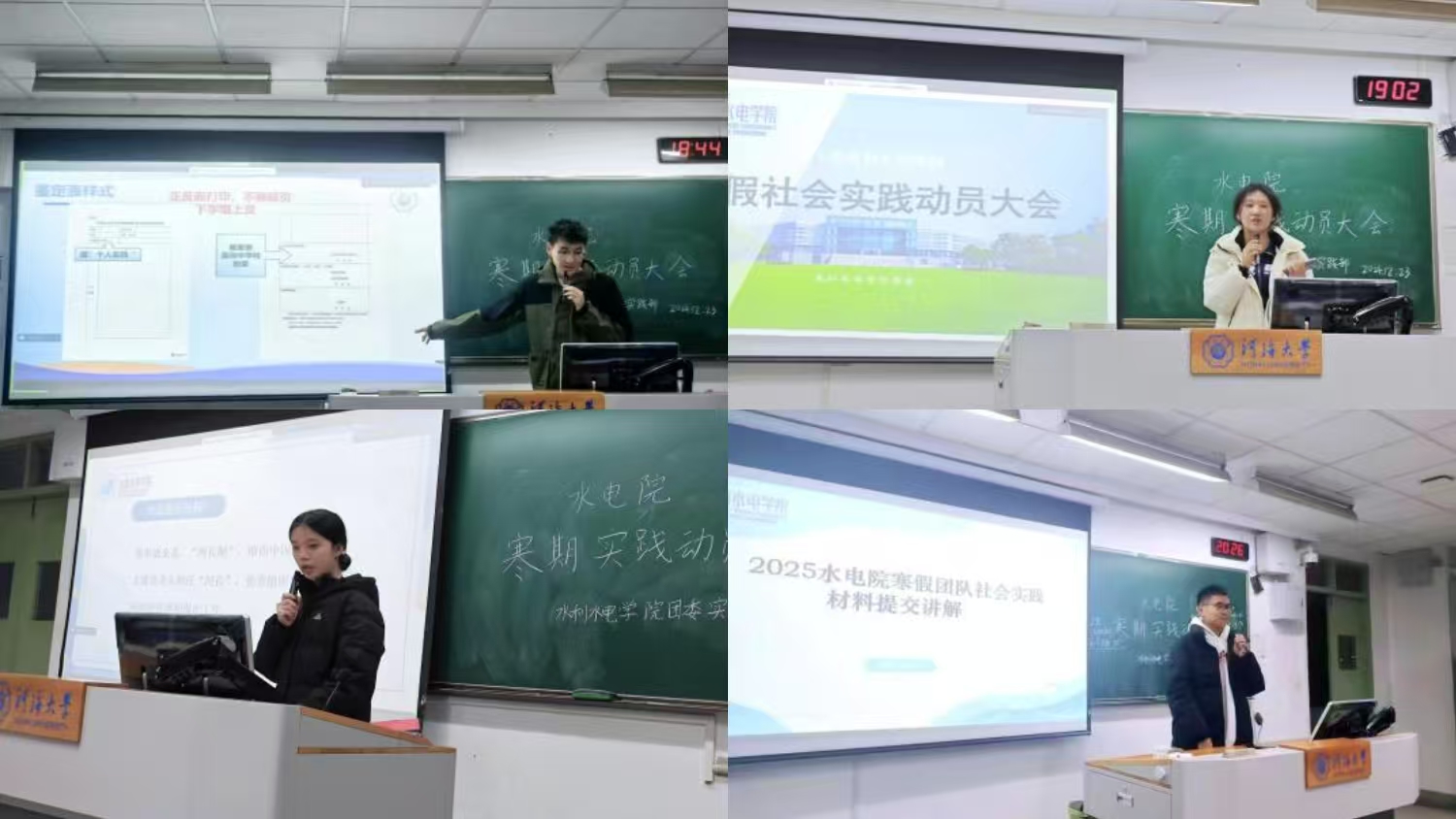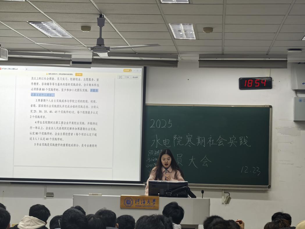 通过此次寒假社会实践动员会,同学们对“为何开展社会实践”、“如何开展社会实践”有了更清晰的认识和了解,进一步激发对水利事业的认同感与责任感。 高辣文 团委将紧密围绕寒假社会实践的相关工作,持续、积极地回应同学们在后续实践进程中遇到的各类问题,后期通过优秀团队经验分享会、评优答辩会等形式,引领学生以饱满的热情投身实践,在实践中彰显河海“水之子”的果敢坚毅与非凡卓越,为我国水利事业的蓬勃发展汇聚青春力量、书写奋斗华章。(图文/水电院团委实践部)