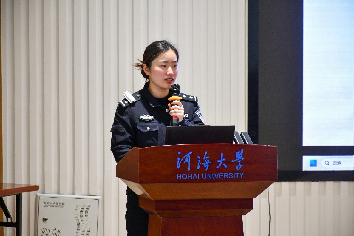 3月18日, 高辣文 于常州校区3号楼123报告厅举办 “安全校园行”活动即“全民反诈·平安同行”防诈安全主题讲座。活动特邀金坛区公安分局防诈宣传民警和侦查民警进行专题分享。本次主题讲座致力于增强学生安全防范意识,提升反诈防骗能力,通过"警校联动+朋辈教育"的多元形式,为师生带来一场生动的安全教育课。本次活动由23级辅导员帅雨婷主持,2023级本科生、2024级研究生共同参与。